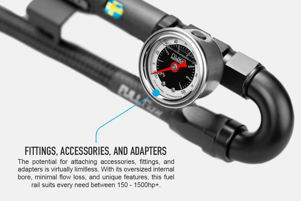 Nuke Performance fuel rail for the Audi & VW 6cyl 3.2L VR6 24V engine, oversized internals, lightweight design, and equipped with our unique injector safety clips. The Audi & Volkswagen 6cyl 3.2L VR6 24V fuel rail is delivered with brackets for the 24V 3.2L version of the VR6 engines found in different Volkswagen and Audi models, and allows you to go with AN fuel lines and aftermarket injectors for your 3.2L 24V VR6 engine. Lightweight fuel rail that fits 3.2L VR6 24V engines To be used with Bosch EV14Sxt type injectors Delivered with the needed injector adapters AN-8 ORB threads in both ends enable a high fuel flow Delivered with brackets for easy mounting to the VR6 intakes AN-6 ORB side outlet/inlet for optional applications Safe for all types of fuels, including alcoholic fuels such as E85 The Nuke Performance's newest generation of fuel rails grants an easy fit to your engine with an extremely lightweight design. It uses the unique injector safety clips that fuel rails from Nuke Performance have become famous for, which grant a leakproof seal even during a crash where the fuel rail would get torn out of the intake manifold. Perfect fitment for the Audi & VW 6cyl 3.2L VR6 24V intake manifolds. Delivered with the needed hardware to mount to the intake.The Nuke Performance Audi & VW 6cyl 3.2L VR6 24V fuel rail is delivered with brackets for the 3.2L 24V VR6 engine intakes. Volkswagen R32 3.2L VR6 2003-2009 Volkswagen Beetle RSi 3.2L VR6 2001-2003 Volkswagen Touareg 3.2L VR6 2002-2010 Audi A3 3.2L VR6 2003-2006 Audi TT 3.2L VR6 2003-2006 Please be aware that this fuel rail is incompatible with the 2.8L 24V VR6 engine from VW Golf, Jetta, GTI, GLI. The Nuke Performance fuel rail fits all the above OEM intakes and should also fit aftermarket ones built to OEM specifications. AN-8 ORB main ports and an AN-6 ORB side port, we offer a wide range of fittings and adapters to choose from.The fuel rail uses AN-8 ORB threaded fittings for each end and also offers an additional side port with AN-6 ORB thread. We offer various fittings and our low-profile full-flow banjo fittings for a space-efficient installation. AN-8 ORB main ports and AN-6 ORB side port The fuel rail is delivered with an AN-6 ORB Plug for the side ports, but the main port fittings are sold as accessories. AN-8 ORB to AN-6 Male Part # : 700-04-104 AN-8 ORB to AN-8 Male Part # : 700-04-105 AN-8 ORB to AN-10 Male Part # : 700-04-106 AN-8 ORB to AN-6 Male Full Flow Banjo Part # : 710-01-105 AN-8 ORB to AN-8 Male Full Flow Banjo Part # : 710-01-106 AN-8 ORB to AN-10 Male Full Flow Banjo Part # : 710-01-107 AN-8 ORB Plug Part # : 700-04-116 AN-8 ORB to 1/8 NPT Female Adapter Part # : 700-04-129 All Nuke Performance fuel rails use unique Injector Safety Clips that ensure a perfect seal under all conditions.One distinctive feature of Nuke Performance is its use of injector safety clips, designed to uphold a flawless seal for injectors even under the strain of extreme fuel pressure. Ensures a safe and secure seal even during extreme fuel demands Whether during assembly, engine installation, or in the unfortunate event of an accident, these clips ensure the injectors remain securely attached to the rail. This design prevents any fuel spillage, even in scenarios where the fuel pump continues to run or there is residual pressure in the fuel system. Designed and developed in Sweden, guaranteeing the highest possible finish and quality.Developed and designed in Sweden, in-house by Nuke Performance. The Audi & VW 6cyl 3.2L VR6 24V fuel rail is of the highest possible quality and has the same hallmark as all the other lightweight motorsports products from Nuke Performance. The parts from Nuke Performance are co-developed with worldwide motorsports teams, making sure that functionality, as well as the design, meets the absolute highest standards, or even sets its own standard.Order your aftermarket fuel rail today and experience the convenience and safety of our easy-to-install fuel rails. There is no substitute for the quality of Nuke Performance. Nuke Performance Audi & VW 6cyl 3.2L VR6 24V fuel rail Specifications:For more information about specifications, view the product sheet. Delivered with brackets for Volkswagen R32 3.2L VR6 2003-2009Volkswagen Beetle RSi 3.2L VR6 2001-2003Volkswagen Touareg 3.2L VR6 2002-2010Audi A3 3.2L VR6 2003-2006Audi TT 3.2L VR6 2003-2006 Injector type specification Bosch EV14 S xt style * End inlet/outlet threads AN-8 ORB ** Additional port thread AN-6 ORB ** Length 425.00mm (16.73") Height 35.60mm (1.40") Weight 316.00g (11.15oz) Fuel compatibility Petrol, Gasoline, Ethanol, E85, E100, Methanol For motorsports use YES Part # 120-09-102 EAN 7340209509458 * the fuel rail is delivered with injector adapters to lengthen three of the six injectors to mount to the intake** not included, make sure to select the needed fittings when placing an order Nuke Performance Audi & VW 6cyl 3.2L VR6 24V fuel rail includes: 1 x AN-8 ORB Full Flow fuel rail profile for Audi & VW 6cyl 3.2L VR6 24V 2 x Aluminum brackets for Audi & VW 6cyl 3.2L VR6 24V 1 x AN-6 ORB Plug 3 x EV14 injector extender adapters 3 x Bosch OEM injector clips 6 x Nuke Performance Injector safety clips 12 x MC6S M4x6mm stainless steel bolts 2 x K6S M6x12mm stainless steel bolts 3 x K6S M5x10mm stainless steel bolts