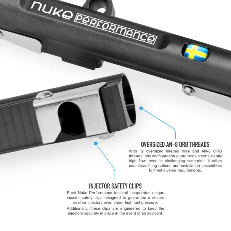 Nuke Performance fuel rails for GM LS1, LS2, LS3, LS6, LS7, L76, and L99 V8 engines, oversized internals, lightweight design, and equipped with our unique injector safety clips. The GM 8cyl LS1, LS2, LS3, LS6, L76, L99 fuel rails is delivered with brackets for the different LS engines and allow you to use AN fuel lines and aftermarket injectors for your iconic V8 engine. Lightweight fuel rail that fits LS V8 intakes To be used with Bosch 14mm injectors AN-8 ORB threads in all ends enable a high fuel flow Delivered with brackets for easy mount to the different LS intakes AN-6 ORB side outlet/inlet for optional applications Safe for all types of fuels, including alcoholic fuels such as E85 The Nuke Performance's newest generation of fuel rails grants an easy fit to your engine with an extremely lightweight design. It uses the unique injector safety clips that fuel rails from Nuke Performance have become famous for, which grants a leakproof seal even during a crash where the fuel rail would get torn out of the intake manifold. Perfect fitment for GM 8cyl LS1, LS2, LS3, LS6, L76, and L99 engines, delivered with the needed hardware to mount to the intake.The Nuke Performance GM 8cyl LS1, LS2, LS3, LS6, L76, L99 fuel rails is delivered with brackets for the different LS engine and is designed to be used together with Bosch 14mm injectors. GM LS1 type intakes - uses EV14L 65mm injectors GM LS3 type intakes - uses EV14K 38mm injectors The LS1 intake setup is design for use with Bosch EV14L (Long) 65mm style injectors, and the LS3 intake setup is designed for Bosch EV14K (Compact) 37.95mm style injectors. The different intakes demand different mounting points and the fuel rails come with the needed hardware for both style intakes. For more information, read the product manual for installation guidance. AN-8 ORB main ports and an AN-6 ORB side port, we offer a wide range of fittings and adapters to choose from.The fuel rail uses AN-8 ORB threaded fittings for each end and offers an additional side port with AN-6 ORB thread. We provide various fittings and our low-profile full-flow banjo fittings for a space-efficient installation. AN-8 ORB main ports and AN-6 ORB side port The fuel rail is delivered with two AN-6 ORB Plugs for the side port but the main port fittings are sold as accessories. AN-8 ORB to AN-6 Male Part # : 700-04-104 AN-8 ORB to AN-8 Male Part # : 700-04-105 AN-8 ORB to AN-10 Male Part # : 700-04-106 AN-8 ORB to AN-6 Male Full Flow Banjo Part # : 710-01-105 AN-8 ORB to AN-8 Male Full Flow Banjo Part # : 710-01-106 AN-8 ORB to AN-10 Male Full Flow Banjo Part # : 710-01-107 AN-8 ORB Plug Part # : 700-04-116 AN-8 ORB to 1/8 NPT Female Adapter Part # : 700-04-129 All Nuke Performance fuel rails use unique Injector Safety Clips that ensure a perfect seal under all conditions.One distinctive feature of Nuke Performance is its use of injector safety clips, designed to uphold a flawless seal for injectors even under the strain of extreme fuel pressure. Ensures a safe and secure seal even during extreme fuel demands Whether during assembly, engine installation or in the unfortunate event of an accident, these clips ensure the injectors remain securely attached to the rail. This design prevents any fuel spillage, even in scenarios where the fuel pump continues to run or there is residual pressure in the fuel system. Designed, and developed in Sweden, guaranteeing the highest possible finish and quality.Developed and designed in Sweden, in-house by Nuke Performance. The GM 8cyl LS1, LS2, LS3, LS6, L76, L99 fuel rails is of the highest possible quality and has the same hallmark as all the other lightweight motorsports products from Nuke Performance. The parts from Nuke Performance are co-developed with worldwide motorsports teams, and LS experts, making sure that functionality, as well as the design, meets the absolute highest standards, or even creating a standard of its own.Order your aftermarket fuel rail today and experience the convenience and safety of our easy-to-install fuel rails. There is no substitute for the quality of Nuke Performance. Nuke Performance LS1, LS2, LS3, LS6, L76, L99 fuel rail Specifications:For more information about specifications, view the product sheet. Delivered with brackets for LS1, LS2, LS3, LS6, L76, L99 Injector type specification Bosch 14mm injectors ** End inlet/outlet threads AN-8 ORB * Additional port thread AN-6 ORB * Length 374.00mm (14.72") / each Height 32.00mm (1.25") Weight 325.00g (11.46oz) / each Fuel compatibility Petrol, Gasoline, Ethanol, E85, E100, Methanol For motorsports use YES Replaces old part # 100-07-203 *** Part # 120-10-101 EAN 7340209509465 * not included, make sure to select the needed fittings when placing an order** depending on intake version, EV14L for LS1 type, EV14K for LS3 type*** old generation that is no longer available for purchase Nuke Performance LS1, LS2, LS3, LS6, L76, L99 fuel rail includes: 2 x AN-8 ORB Full Flow fuel rail profile for GM LS V8 engines 4 x Aluminum brackets for GM LS V8 engines 4 x Bracket adapters for GM LS1 type intakes * 2 x AN-6 ORB Plug 8 x Nuke Performance Injector safety clips 16 x K6S M4x6mm stainless steel bolts 8 x K6S M6x12mm stainless steel bolts * 8 x K6S M6x8mm stainless steel bolts * * Refer to the instruction manual to determine which parts are required for each type of intake.