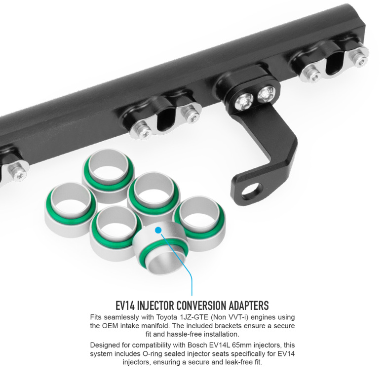 The Toyota 6cyl 1JZ-GTE (Non VVT-i) fuel rail is delivered with brackets for the OEM non-VVTi intake manifold and allows you to go with AN fuel lines, and aftermarket high flow fuel injectors (EV14L 65mm) for your classic Toyota engine.
