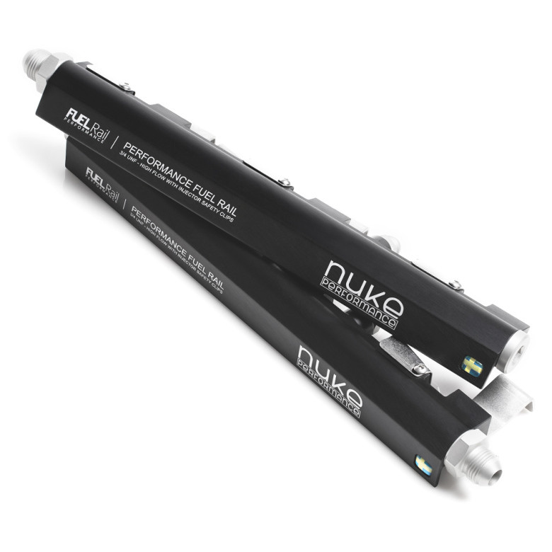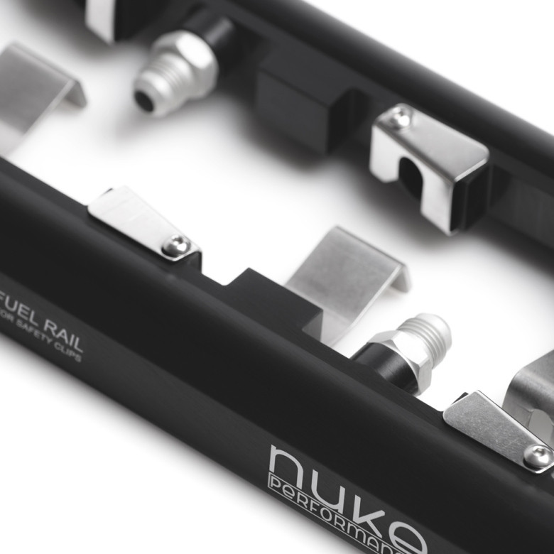 A Nuke Performance unique feature is the injector safety clips that ensure the injectors maintain a perfect sealing even during extreme fuel pressure usage. Whether during assembly, install on the engine or in the unfortunate case of an accident, the injectors will remain solidly on the rail. No fuel is spilled even if the fuel pump continues to run or there is latent pressure in the fuel system.