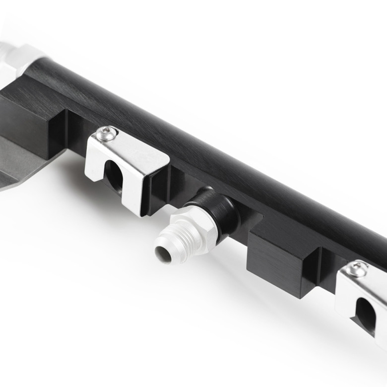 There is close to no space available for fittings when running an aftermarket fuel rail on the 3800 / L36 engines. We have made a solution with the smaller 1/4 BSPP AN-6 fittings on the bottom side of the fuel rail. This makes you able to choose between running AN-8 line into the fuel rail and AN-6 out, or running AN-8 in, then AN-6 between the fuel rails as a bridge and then AN-8 out of the second fuel rail. Thanks to the over-dimensioned internal diameters of the fuel rails and the included fittings this guarantees for perfect and sufficiently high fuel flow for even the highest power usage.