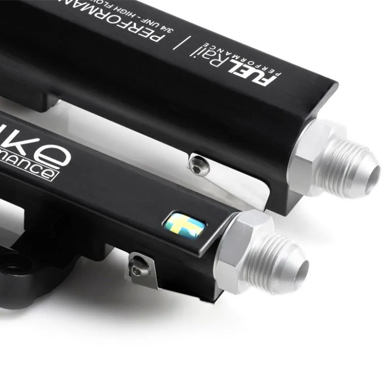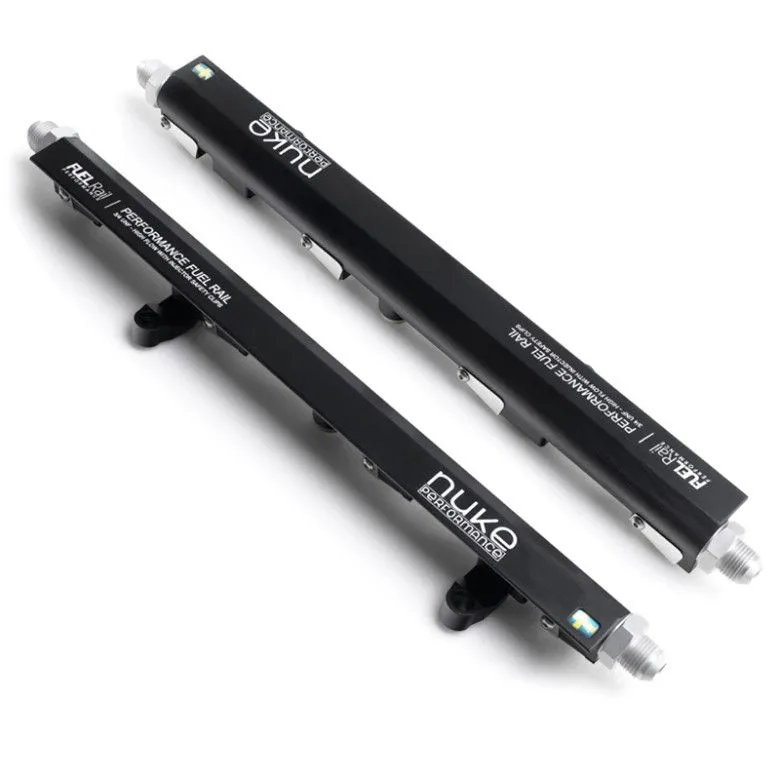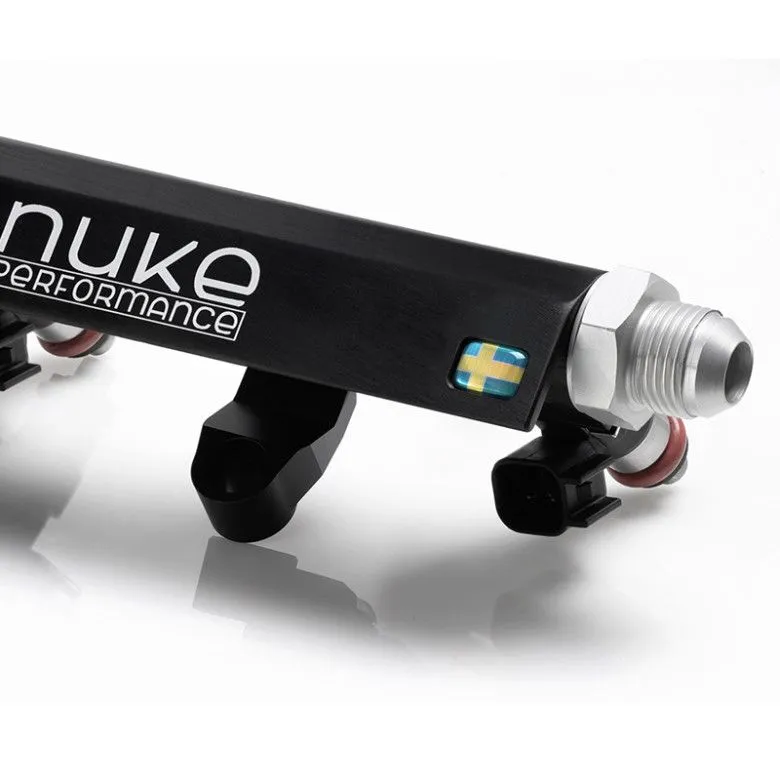 Nuke Performance Chevrolet LS High-Performance Fuel Rail GM / Chevrolet "LS" high-performance bolt-on Fuel Rail kit for LS1, LS2, LS3, LS6, L76, L99. Motorsports fuel rail with unique injector safety clips that fits both common intake styles. 100% safe for alcoholic fuels such as ethanol. Lightweight motorsports fuel rail Unique injector safety clips Made in Sweden 100% E85 Proof Delivered with AN-8 fittings Bolt-on fitment, everything is included for : • GM LS1 • GM LS2 • GM LS3 • GM LS6 • GM L76 • GM L99 Give your engine over-dimensioned fuel flow for serious power outtake and the looks that are the Nuke Performance signum. Designed to look awesome and perform even better, this motorsports-grade fuel rail is the market-leading Chevrolet LS fuel rail with the most functionality and delivered with unique injector safety clips and bolt-on brackets for a safe and easy mount to any of the listed LS engine models. Developed with high demands from motorsport Co-developed with worldwide motorsports teams, this fuel rail is set to perform under all conditions and for any horsepower requirement. This is the best 3/4" UNF fuel rail on the market for the LS engines with the highest flow capacity. Delivered with AN-8 fittings with alcoholic-fuel safe Viton o-rings. AN-6 and AN-10 fittings is optional. Injector Safety Clips ensures sealing and safety A Nuke Performance unique feature is the injector safety clips that ensure the injectors maintain a perfect sealing even during extreme fuel pressure usage. Whether during assembly, install on the engine or in the unfortunate case of an accident, the injectors will remain solidly on the rail. No fuel is spilled even if the fuel pump continues to run or there is latent pressure in the fuel system. Lightweight bolt-on brackets, everything you need is included Bolt-on lightweight aluminum brackets are included with the kit, designed to work with both common LS intake heights and styles, ensuring compatibility across the entire range of LS engines. Assembly instructions are delivered with the kit, we ensure that everything you need is included within the kit, add injectors of choice and you are ready to go. Made in Sweden, guaranteeing the highest possible quality Developed, designed and manufactured in Sweden, inhouse by Nuke Performance. This is of the highest possible quality and with the same hallmark as all the other range of the lightweight motorsports range from Nuke Performance. This guaranteeing the highest possible quality - there is no substitute for the quality of Nuke Performance. Optional AN-8 braided fuel hose cross over plumbing kit If wanted, choose the cross over plumbing kit that makes a true bolt-on solution for installation for the LS engine range. Comes with 2x AN-8 90° hose ends with an E85 proof braided fuel hose. A lightweight and convenient option for fast and secure installation. Partno: 100-07-204 LS Fuel rail kit includes: 4 x 3/4 UNF AN-8 fittings for inlets / outlets 4 x Viton o-ring, safe for ethanol and petrol use 2 x 1/4 BSPP Plug for middle outlet ports 8 x M6*12mm for LS1 type mounting 8 x M6*8mm for LS3 type mounting 16 x M4*6mm for safety clips 8 x Stainless steel injector safety clips 4 x Aluminium mounting brackets 4 x Aluminium distance brackets SPECIFICATIONS Fits injectors : • LS1 type fuel rail : Bosch EV 14 L • LS3 type fuel rail : Bosch EV 14 K Compact Technical information : • Machined aluminium extrusion 6082-T6. • Delivered with 4x 3/4 UNF AN-8 fittings and 2x 1/4 BSPP plug. • 100% safe for alcoholic fuels such as E85. • Extremely lightweight design for motorsports use. • Stainless injector safety clips for safe seal operation. • Billet bolt-on brackets for listed LS engine range included with the kit. • Anodized finish for long lasting function and corrosion free appearance. • 17,5mm internal diameter which guarantees high and reliable flow. • Laserengraved and proudly branded with the Swedish flag. Measurements : Height : 36 mm Depth : 33 mm Download installation instructions (.pdf)