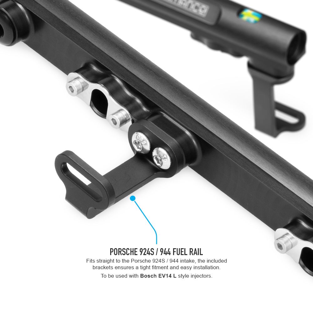 The Porsche 924S / 944 fuel rail is delivered with brackets for the 924S and 944 intake and allows you to go with AN fuel lines and aftermarket injectors for your classic Porsche models.