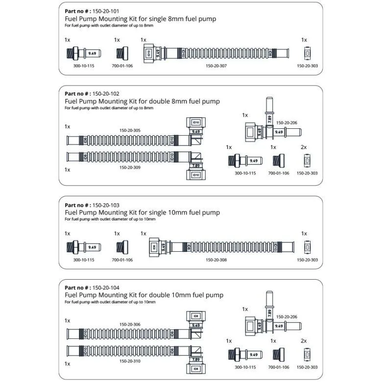Nuke Performance SAE in-tank fuel pump mounting kits, safe for all type of fuels including ethanol and ideal for motorsports with quick connect fittings for easy maintenance and long live durability. These in-tank fuel hose kits are of motorsports standards and are ideal for quick, safe and sturdy mounting of your high-pressure in-tank fuel pumps from Aeromotive, AEM, Deatschwerks, Ti Automotive (Walbro) and more.  Lightweight and extremely durable  100% E85 Approved  Easy maintenance with quick-connect fittings  Quick and easy installation  A high-pressure system with minimal flow loss  For single or dual internal fuel pumps   Available for single or dual in-tank fuel pump setups and for fuel pumps with 7.5 - 10mm outlet diameter. Find your fuel pump in the list below and choose the correct size when placing order.   Fuel pump Mounting Kit Ø 7 - 8.2mm : • Deatschwerks 200 (DW200) • Deatschwerks 300 (DW300) • fuel pump with a maximum outlet Ø of 8.1mm   Fuel pump Mounting Kit Ø 8.4 - 10mm : • AEM 320L • Aeromotive Stealth 340 • Aeromotive Stealth 450 • Bosch BR540 • Deatschwerks 400 (DW400) • Ti Automotive (Walbro) GST400 • Ti Automotive (Walbro) GST450 • Ti Automotive (Walbro) GST520 • fuel pump with a maximum outlet Ø of 10.2mm Convoluted nylon fuel hose for high flow and long durability With the in-tank convoluted black nylon fuel hose, you will never have to worry again about how the fuel hoses will handle being soaked in fuel during long and demanding seasons or even if left in fuel when not being used for a long time. It fits within tight installations such in the Nuke Performance CFC Units and the Nuke Performance Fuel Surge Tanks. SAE quick connect fittings for all type of fuels and easy maintenance  The in-tank fuel pump kits utilize high flow SAE quick connect fittings with Viton O-rings. SAE J2044 standard fittings for high flow and maximal functionality and durability. Safe for all fuels, including alcoholic fuels such as ethanol. This type of fittings makes your maintenance quick and safe with minimal tooling and effort.  Delivered with everything you need for an easy installation The Nuke Performance in-tank fuel pump mounting kit comes with all the fittings, hoses and accessories you need for an easy and simple installation. For more information, download the product manual and learn more about each setup. This is the easiest way to install fuel pumps within the Nuke Performance CFC Unit and Fuel Surge Tanks and is not developed to be used in other applications except the Nuke Performance fuel performance products.   Single fuel pump kit includes: 1 x 1/4 BSPP to SAE 9.49 Male fitting 1 x 1/4 BSPP Plug 1 x Convoluted 350mm fuel hose, preassembled with SAE fitting 1 x Single ear hose clamp Dual fuel pump kit includes: 1 x 1/4 BSPP to SAE 9.49 Male fitting 1 x 1/4 BSPP Plug 1 x SAE 9.49 3-Way to 7.89 / 9.49 Male fitting 2 x Convoluted 350mm fuel hose, preassembled with SAE fitting 2 x Single ear hose clamp Download User Manual (.pdf)