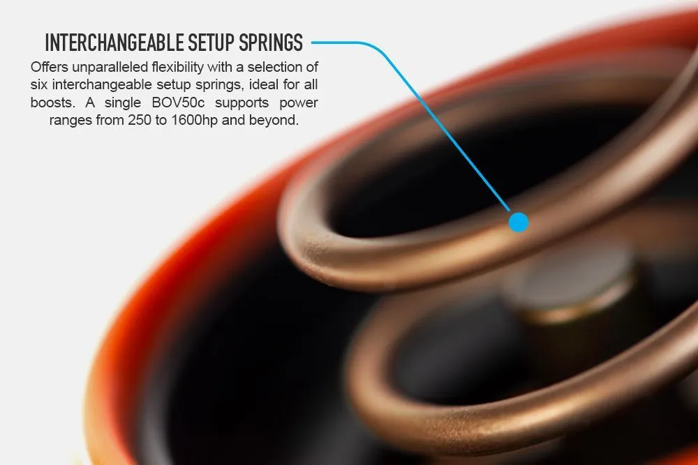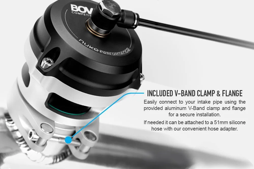 The second-generation Blow Off Valve from Nuke Performance, with cutting-edge function and an even quicker response. Highest possible flow capacity and unmatched performance. The BOV50c is the upgraded version of the classic Blow Off Valves from Nuke Performance. Uses the same flange as the old one, a quick and easy swap with no need for new intake pipes. Its 50mm (1.97") valve and superior enhanced diaphragm ensure swift response and precise boost release. - Enhanced reinforced diaphragm technology- Swift response and precise boost release- Billet aluminum V-Band clamp and flange are included- 1/4 BSPP top-mounted vacuum port- Interchangeable setup spring, support 250 to 1600hp+- Lightweight Blow Off Valve for motorsport installations Equipped with a low friction valve guidance, the Blow Off Valve BOV50c V-Band offers an extremely swift response and is ready for some serious boost and power. We believe this upgraded version of the popular first-generation dump valve has the highest flow capacity for an atmospheric blow-off valve. Easy to connect to your intake pipe with the included V-Band flange and clamp, safe and secure installation even when you push your engine to its limits.The Nuke Performance Blow Off Valve BOV50c V-Band comes with an included aluminum billet V-Band clamp and weldable aluminum flange. This provides for a safe and secure installation even when pushed to the limit. The aluminum 60mm V-Band clamp and flange are included Optional 51mm (2") hose connector available - fit the V-Band to your silicon hose A stainless flange is available if needed and we also have a 51mm (2") hose adapter that lets you mount the blow-off valve to a silicon hose without the need for welding or custom manufacturing.Spare Aluminum V-Band Flange Part # : 910-02-101Stainless Steel V-Band Flange Part # : 910-02-102Spare Aluminum 60mm V-Band Clamp Part # : 910-02-10151mm Hose Adapter for BOV50c Part # : 920-05-101 Ideal for any level of boost, thanks to its adaptability with a diverse selection of interchangeable setup springs, catering to your specific requirements.The Nuke Performance Blow Off Valve BOV50c V-Band offers unparalleled flexibility with a selection of six interchangeable setup springs, ideal for all boosts. The BOV50c has a "blue" spring preinstalled, and the swap for another spring is very easy thanks to the three-bolt design. * The BOV50c is equipped with a pre-installed Blue Spring.** Used for supercharger applications only Select the BOV spring pressure rating based on your engine´s vacuum reading at idle when the engine is at ideal operating temperature. Boost is unrelated to spring pressures; it is solely associated with vacuum. The lowest rate spring (Light Gray) is specifically designed for superchargers and is not intended for use with turbochargers.BOV50c Light Gray Spring Part # : 9200-01-016BOV50c Green Spring Part # : 9200-01-017BOV50c Magenta Spring Part # : 9200-01-018BOV50c Blue Spring Part # : 9200-01-019 (pre-installed)BOV50c Red Spring Part # : 9200-01-020BOV50c Black Spring Part # : 9200-01-021 The BOV50c uses enhanced diaphragm technology and low friction valve guidance to ensure swift response and seamless operation for any need between 200 to 1600hp+.The 50mm diameter valve moves smoothly with minimal friction, thanks to the Teflon-treated hard anodized diaphragm guidance. This guarantees reliable performance even under rigorous use in motorsport applications. A single BOV50c supports anywhere between 200 to 1600hp+ The Viton seal together with the new superior enhanced diaphragm the Nuke Performance Blow Off Valve BOV50c V-Band has an unmatched swift response and seamless operation which promotes efficient turbo spooling and maximum performance. The new reinforced diaphragm ensures exceptional durability, reducing maintenance requirements. The top-mounted 1/4 BSPP vacuum port gives you endless possibilities to connect the blow-off valve to your vacuum line.With the 1/4 BSPP top-mounted vacuum port, it effortlessly links to your vacuum line for boost reference. We offer a wide range of fittings, including barb hose fittings, and quick-connect tube adapters, available in straight and banjo versions. To ensure precise functionality in line with our specifications, we recommend using a 6mm inner diameter hose or tube.1/4 BSPP Banjo Quick Connect to 6mm tubing Part # : 300-10-1191/4 BSPP Banjo Qucik Connect to 8mm tubing Part # : 590-10-1041/4 BSPP Straight Quick Connector to 6mm tubing Part # : 300-10-1031/4 BSPP Straight Barb Fitting for 4mm hose Part # : 300-10-1131/4 BSPP Straight Barb Fitting for 6mm hose Part # : 300-10-1111/4 BSPP Straight Barb Fitting for 8mm hose Part # : 300-10-110 What is the purpose of a blow-off valve, and how does it work?An atmospheric (such as the BOV50c from Nuke Performance ) BOV releases the boost into the atmosphere when the throttle closes, preventing compressor surge and ensuring the turbo´s longevity. A BOV is essential for the turbo´s lifespan but also plays a significant role in enhancing performance. By releasing excess boost, the BOV prevents compressor surge and reduces lag by allowing the turbo to spin up more quickly when the throttle valve is opened again. The needed vacuum reference "detects" throttle closure, prompting the valve to open and release excess boost. The Nuke Performance BOV50c uses an oversized 1/4 BSPP vacuum port, that guarantees that the vacuum reading is accurate and swift. Designed and developed in Sweden, guaranteeing the highest possible precision, quality, and performance.Developed and designed in Sweden, in-house by Nuke Performance. The Nuke Performance Blow Off Valve BOV50c V-Band is of the highest possible quality and embodies the exceptional standards characteristic of all lightweight motorsports products from Nuke Performance. The BOV50c is co-developed with worldwide motorsports teams, ensuring that this second generation surpasses the first one and meets the absolute highest stand