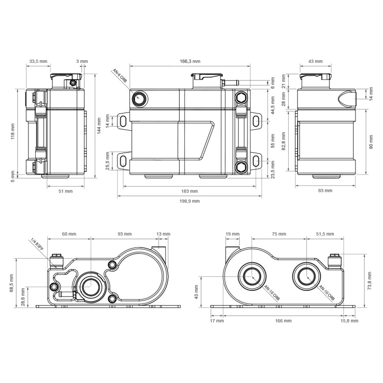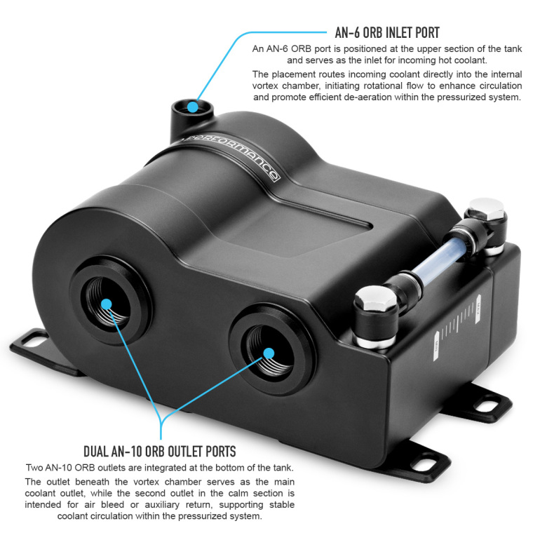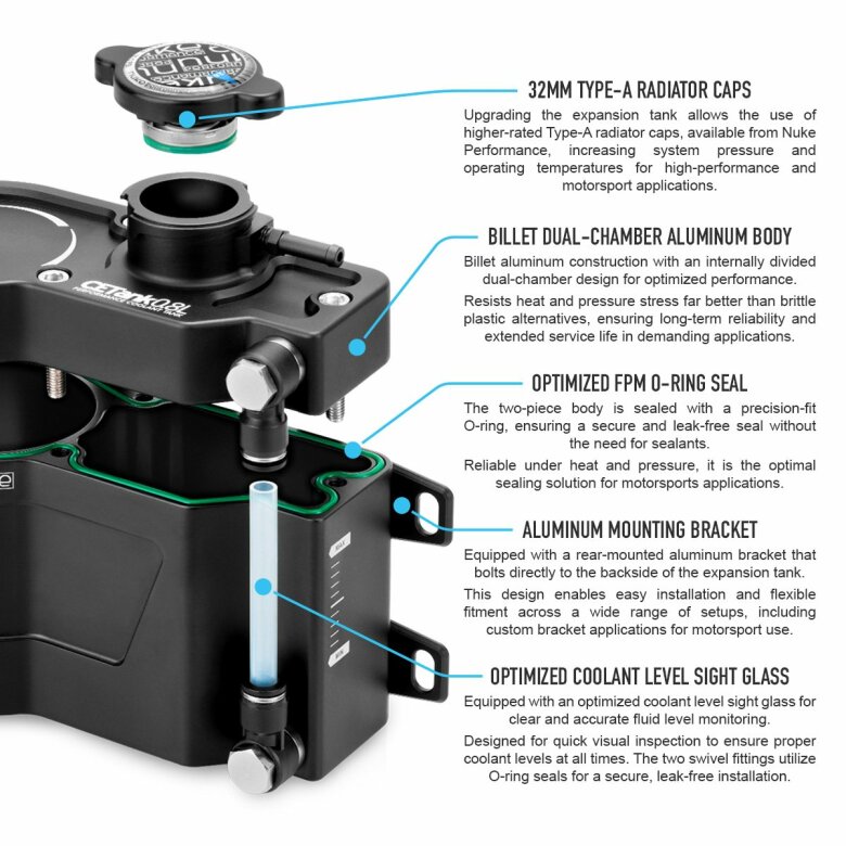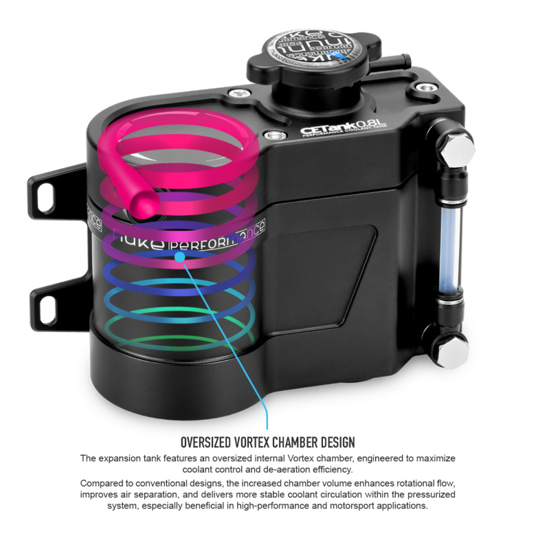 Nuke Performance Zbiornik wyrównawczy płynu chłodzącego 0.8L Performance z komorą Vortex Nuke Performance Coolant Expansion Tank 0.8L Performance to wysokiej klasy zbiornik wyrównawczy zaprojektowany do samochodów o wysokich osiągach oraz zastosowań motorsportowych, gdzie kluczowe znaczenie mają kontrola płynu chłodzącego, skuteczne odpowietrzanie układu oraz niezawodność w ekstremalnych warunkach pracy. Zbiornik wykonany jest z lekkiego frezowanego aluminium typu billet i wyposażony w powiększoną komorę Vortex, która znacząco poprawia separację powietrza z płynu chłodzącego. Dzięki temu układ chłodzenia pracuje stabilniej, a cyrkulacja płynu pozostaje efektywna nawet podczas intensywnej jazdy torowej. Produkt został zaprojektowany jako element ciśnieniowego układu chłodzenia, a nie jako standardowy zbiornik przelewowy. Najważniejsze cechy powiększona komora Vortex poprawiająca odpowietrzanie układu chłodzenia dwukomorowa konstrukcja (dual chamber) zapewniająca stabilny przepływ płynu kompatybilność z korkami chłodnicy Type-A (32 mm) pojemność 0,8 litra wejście AN-6 ORB dwa wyjścia AN-10 ORB szczelna konstrukcja z uszczelnieniem O-ring umożliwiająca pracę pod wysokim ciśnieniem wykonany z lekkiego i wytrzymałego billet aluminium Komora Vortex – skuteczne odpowietrzanie układu Centralnym elementem konstrukcji jest powiększona komora Vortex. Gorący płyn chłodzący trafia do niej stycznie przez port AN-6 ORB, co powoduje powstanie ruchu wirowego. Dzięki zwiększonej objętości komory następuje skuteczniejsza separacja powietrza z płynu chłodzącego, co stabilizuje przepływ w układzie i poprawia jego wydajność w porównaniu do standardowych zbiorników. Dwukomorowa konstrukcja zbiornika Zbiornik posiada wewnętrzną konstrukcję dwukomorową z kontrolowanymi kanałami przepływu w górnej i dolnej części. Takie rozwiązanie zapewnia: stabilną cyrkulację płynu chłodzącego efektywną separację powietrza równomierne zarządzanie ciśnieniem w układzie chłodzenia Przyłącza i porty wejście AN-6 ORB kierujące płyn bezpośrednio do komory Vortex główne wyjście AN-10 ORB umieszczone pod komorą Vortex dodatkowe wyjście AN-10 ORB do odpowietrzania lub powrotu płynu port przelewowy 1/16 NPT (adapter na wąż 6 mm w zestawie) Kompatybilność z korkami chłodnicy Type-A Zbiornik posiada szyjkę chłodnicy o średnicy 32 mm, kompatybilną ze standardowymi korkami Type-A. Umożliwia to zastosowanie korków o wyższym ciśnieniu roboczym, co podnosi temperaturę wrzenia płynu chłodzącego i zwiększa stabilność termiczną w zastosowaniach sportowych. Dostępne korki Nuke Performance: 1.1 BAR (16 PSI) – nr części 452-01-011 1.3 BAR (18.9 PSI) – nr części 452-01-013 1.5 BAR (21.8 PSI) – nr części 452-01-015 2.0 BAR (29 PSI) – nr części 452-01-020 Specyfikacja techniczna pojemność zbiornika: 0,8 L przyłącze korka chłodnicy: 32 mm Type-A (korek nie jest w zestawie) gwint wejścia: AN-6 ORB gwinty wyjść: 2 × AN-10 ORB port przelewowy: 1/16 NPT zakres ciśnienia pracy: 0 – 2.50 BAR konstrukcja zbiornika: dual chamber z funkcją vortex odczyt poziomu płynu: tak (gwint 1/4 BSPP) Wymiary szerokość: 166,3 mm wysokość: 144,0 mm głębokość: 83,0 mm Waga: 1232 g Zawartość zestawu 1 × zbiornik wyrównawczy płynu chłodzącego 0,8 L 1 × adapter 1/16 NPT → króciec 6 mm 1 × aluminiowy uchwyt montażowy śruby montażowe ze stali nierdzewnej 2 × złącze banjo 1/4 BSPP → rurka 8 mm wskaźnik poziomu płynu (PCT pipe reading glass) główna uszczelka zbiornika Produkt został zaprojektowany i opracowany w Szwecji przez Nuke Performance, bez kompromisów w zakresie konstrukcji, materiałów i osiągów – we współpracy z profesjonalnymi zespołami motorsportowymi.