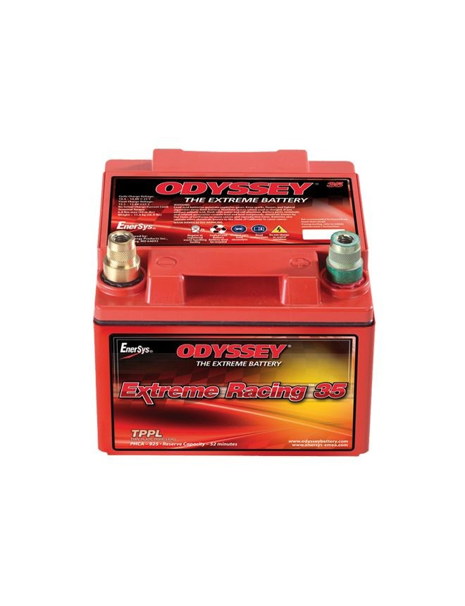 ODYSSEY Extreme Racing 35 battery Ta akumulator przeznaczony do zawodów pozwala oszczędzić miejsce i masę, ponieważ zapewnia więcej energii przy tej samej objętości. Solidna konstrukcja dzięki wzmocnionym spoinom. Akumulator umożliwia rozruch nawet przy zaledwie 20% pojemności. Ma większą pojemność resztkową i wyższą sprawność masową, co najmniej o 30%. Magazynowanie bez użycia do 2 lat. UWAGA:Prosimy przeczytać dołączoną instrukcję obsługi w formacie PDF! Aby akumulator służył długo, należy utrzymywać go blisko pełnego naładowania, tj. około 12,8 V. Dla zapewnienia prawidłowego ładowania konieczne jest użycie dedykowanej ładowarki, takiej jak C-Tek, która zapewnia 100% naładowania (nawet 108% w niektórych modelach). Zwykła ładowarka naładuje akumulator Odyssey jedynie do około 80%. Moment dokręcania konektorów: 6.8NmZakres temperatur pracy: -40°C do +60°C ODDYSSEY Extreme Racing 15 Moc rozruchowa (5 sekund) 900 Wymiary (mm) Dostępny prąd przy -18° (30 s: do 7.2V) 330 - Długość 169 Pojemność znamionowa (dostępny prąd/20 godzin) 28 - Szerokość 179 Dostępny prąd / 10 godzin 27 - Wysokość 148 Rezerwa pojemności (minuty)* 48 Masa (kg) 11.5 Prąd zwarciowy (A) 1140 Rezystancja wewnętrzna (mΩ) 4.3 *Liczba minut, przez które akumulator może dostarczać 25A w 25° do napięcia odcięcia 10.5V Wskazówka zespołu GT2i: nigdy nie używaj akumulatora o napięciu niższym niż 11.50V! Nieprzestrzeganie tych zaleceń spowoduje utratę gwarancji.