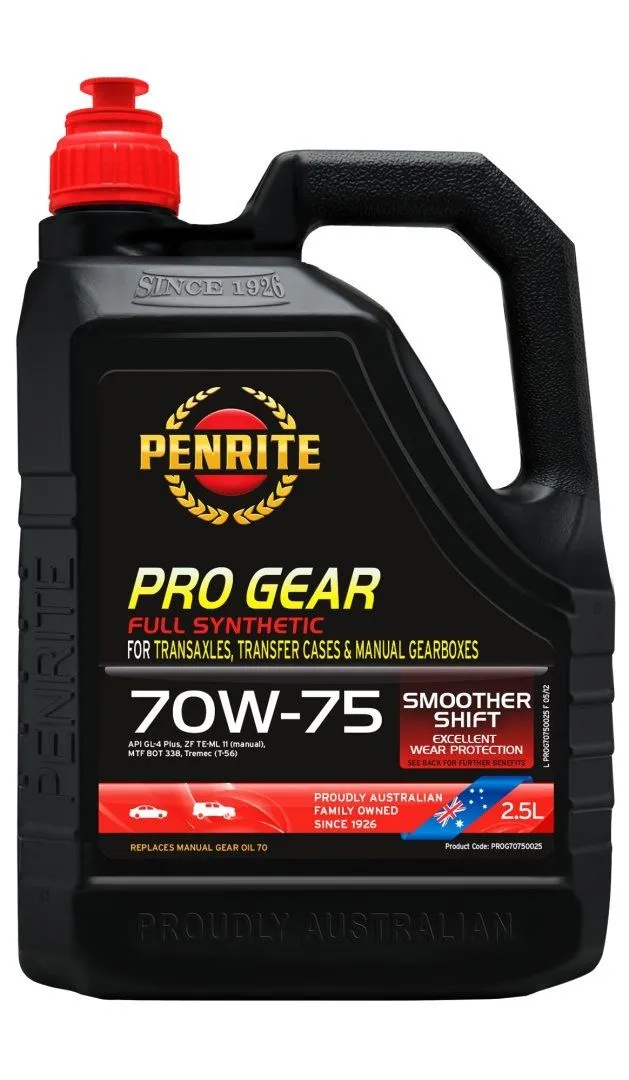 Penrite PRO Gear 70W-75 Full Synthetic 2.5L Najwyższej jakości, bardzo wydajny, w pełni syntetyczny olej, produkowany z mieszanki olei syntetycznych zawierających estry. Olej bazowy Full Synthetic Pro Gear 70W-75 to najwyższej jakości, bardzo wydajny, w pełni syntetyczny olej, produkowany z mieszanki olei syntetycznych zawierających estry. Wykorzystuje najnowszą technologię, specjalne dodatki zapewniające długą żywotność oraz spełnia normy API GL - 4 Plus oraz normy wielu innych producentów. ZASTOSOWANIE Pro Gear 70W-75 jest przeznaczony głównie do 5- i 6-biegowych manualnych skrzyń biegów oraz układów transaxle w samochodach osobowych, z napędem 4WD i lekkich dostawczych takich jak: BMW, Ford Falcon XR/FPV BA/BF/FG (T-56), Opel Vectra 6 -biegowe (T-56), Jaguar S 2.7L D, Land Rover Discovery 3/Freelander 2, VW skrzynie 6-biegowe (nie DSG), skrzynie biegów ZF S5-31, S5-39, S6-37 i S6-53. Pro Oil 70W-75 jest idealny do skrzyń biegów i skrzyń rozdzielczych, które wymagają płynów do przekładni automatycznych lub do pojazdów, które mają problemy ze zmianami biegów przy stosowaniu płynów o wyższej lepkości. Pro Oil 70W-75 może być używany tam, gdzie podane są następujące numery części: BMW 2300 1434404 BMW 2300 7533513 Ford 52171VX00 GM1052931 VW G052171 VW G052178 VW G052798 ZALETY PRODUKTU Płynne przełożenie przez cały okres między wymianami oleju Zwiększona ochrona przed utlenianiem, mniejsze gromadzenie się szkodliwych osadów Lepsza wytrzymałość w porównaniu z płynami do przekładni automatycznych Zawiera syntetyczne oleje bazowe zapewniające dłuższą żywotność Nie uszkadza powierzchni mosiężnych lub z brązu Szybki przepływ przy rozruchu zapewniający dobre przełożenie biegów NORMY BRANŻOWE API GL-4 Plus ZF TE-ML11( manual) MTF BOT338 Tremac T-56