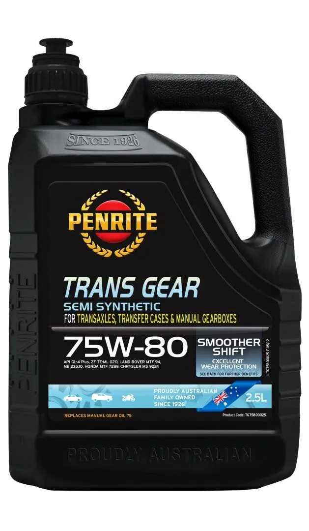 Penrite Trans Gear 75W-80 Semi Synthetic 2.5L Bardzo wydajny, półsyntetyczny olej przeznaczony do manualnych skrzyń biegów. Olej bazowy Semi Synthetic Trans Gear 75W-80 to bardzo wydajny, półsyntetyczny olej przeznaczony do manualnych skrzyń biegów. Wykorzystuje najnowszą technologię, specjalne dodatki zapewniające długą żywotność oraz zawiera unikatowy modyfikator lepkości zapewniający lepszą wydajność w niskich temperaturach. Spełnia normy API GL - 4 Plus oraz normy wielu innych producentów. ZASTOSOWANIE Trans Gear 75W-80 jest przeznaczony do manualnych skrzyń biegów, skrzyń rozdzielczych oraz układów transaxle w samochodach osobowych, z napędem 4WD i lekkich dostawczych. Jest odpowiedni do niektórych skrzyń manualnych ZF w ciężarówkach oraz do skrzyń BTR T-5. Trans Gear 75W-80 zawiera zaawansowane, nieagresywne czynniki chemiczne, dzięki czemu olej ten może zastąpić syntetyczne oleje silnikowe 10W-30 lub 5W-40 używane w manualnych skrzyniach biegów oraz w skrzyniach motocyklowych. Trans Gear 75W-80 może być również używany w niektórych starszych manualnych skrzyniach biegów, które wymagają płynów do przekładni automatycznych oraz w pojazdach, gdzie występują problemy z przełożeniem biegów w przypadku stosowania płynów o dużej lepkości. ZALETY PRODUKTU Płynne przełożenie w trakcie całego okresu między wymianami oleju Zwiększona ochrona przed utlenianiem, mniejsze gromadzenie się szkodliwych osadów Doskonała ochrona przed zużyciem Zawiera syntetyczne oleje bazowe zapewniające dłuższą żywotność Nie uszkadza powierzchni mosiężnych lub z brązu NORMY BRANŻOWE API GL4 PLUS ZF TE-ML 02D MB 235.10