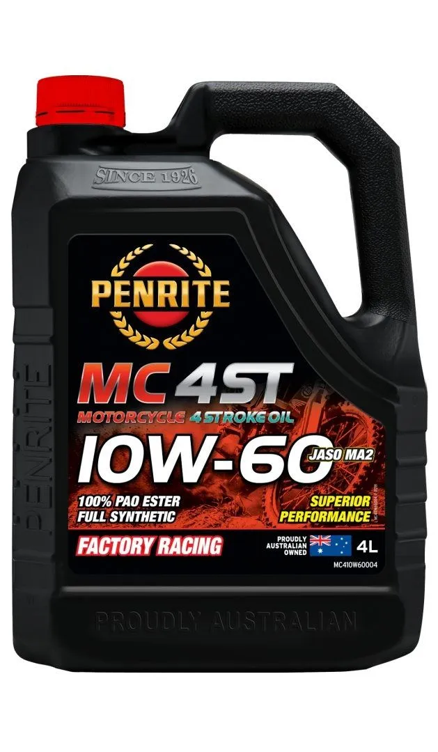 Penrite MC-4ST 10W-60 100% PAO ESTER Full Synthetic 4L MC-4ST 10w60 jest olejem silnikowym klasy Premium wyprodukowanym w oparciu o najwyższej jakości bazę olejową, która w 100% składa się z mieszanki olejów z Gr. IV PAO oraz Gr.V Estrów. Dzięki zastosowanej bazie PAO/Estrowej olej zapewnia ekstremalną wytrzymałość filmu olejowego w wysokich temperaturach pracy oraz doskonała odporność na ścinanie nawet podczas najwyższych obciążeń. Olej zawiera również zaawansowane technologicznie dodatki w tym pakiet FULL ZINC + ( zawartość ZDDP powyżej 1800 ppm ). Dzięki takiej formule olej zapewnia doskonałe osiągi, jak również najwyższą poziom ochrony silnika, skrzyni biegów oraz sprzęgła zarówno podczas użytkowania w warunkach drogowych jak i w najcięższym środowisku rywalizacji sportowej. MC-4ST 10w60 przewyższa wymagania norm API SN/CF oraz JASO MA MC-4ST 10w-60 może być stosowany w aplikacjach, w których zalecany jest olej o lepkości 10w-50 lub 15w50. Lepkość 10W-60 Olej bazowy 100% PAO ESTER Full Synthetic Rodzaje paliwa Petrol / Diesel, Petrol, Racing ZASTOSOWANIE MC-4ST 10w60 jest przeznaczony do stosowania we wszystkich silnikach czterosuwowych, w konstrukcjach z mokrym sprzęgłem doskonale zabezpiecza sprzęgło przed poślizgiem. Może być stosowny w motocyklach drogowych, sportowych, terenowych oraz Enduro,a także w quadach oraz skuterach. MC-4ST 10w60 wyróżnia się ponadprzeciętnymi właściwościami użytkowymi podczas pracy silnika w wysokich temperaturach oraz podczas użytkowania w środowisku wysokich obciążeń. Rekomendowany jest w szczególności dla takich marek jak Aprilia, Benelli, Cagive, Husqvarna, KTM, Moto Guzzi, MV Augusta oraz innych. MC-4ST 10w60 może być wykorzystywany w silnikach napędzanych benzyną, nitro, metanolem. ZALETY Mieszanka PAO i Estrów zapewnia maksymalną ochronę w czasie pracy w wysokich temperaturach, zapewniając przy tym doskonałe osiągi Pakiet FULL ZINC +zapewnia dodatkową ochronę przeciw zużywaniu się elementów silnika Przewyższa wymagania norm API SN oraz JASO MA Zapewnia maksymalną ochroną przeciw zużywaniu się silnika, ogranicza do minimum gromadzenie się osadów oraz depozytów na tłokach, tworzących się zwykle w warunkach pracy w wysokich temperaturach Wzmacnia moc silnika oraz przyspieszenie Przetestowany w warunkach rajdowych ( Penrite Honda Racing Team) Chroni przeciw ślizganiu się sprzęgła, w motocyklach z mokrym sprzęgłem NORMY BRANŻOWE API SN/CF JASO MA2 SUITABLE FOR USE WHERE SPECIFICATIONS BELOW ARE REQUIRED API SJ/CF API SL/CF API SM/CF