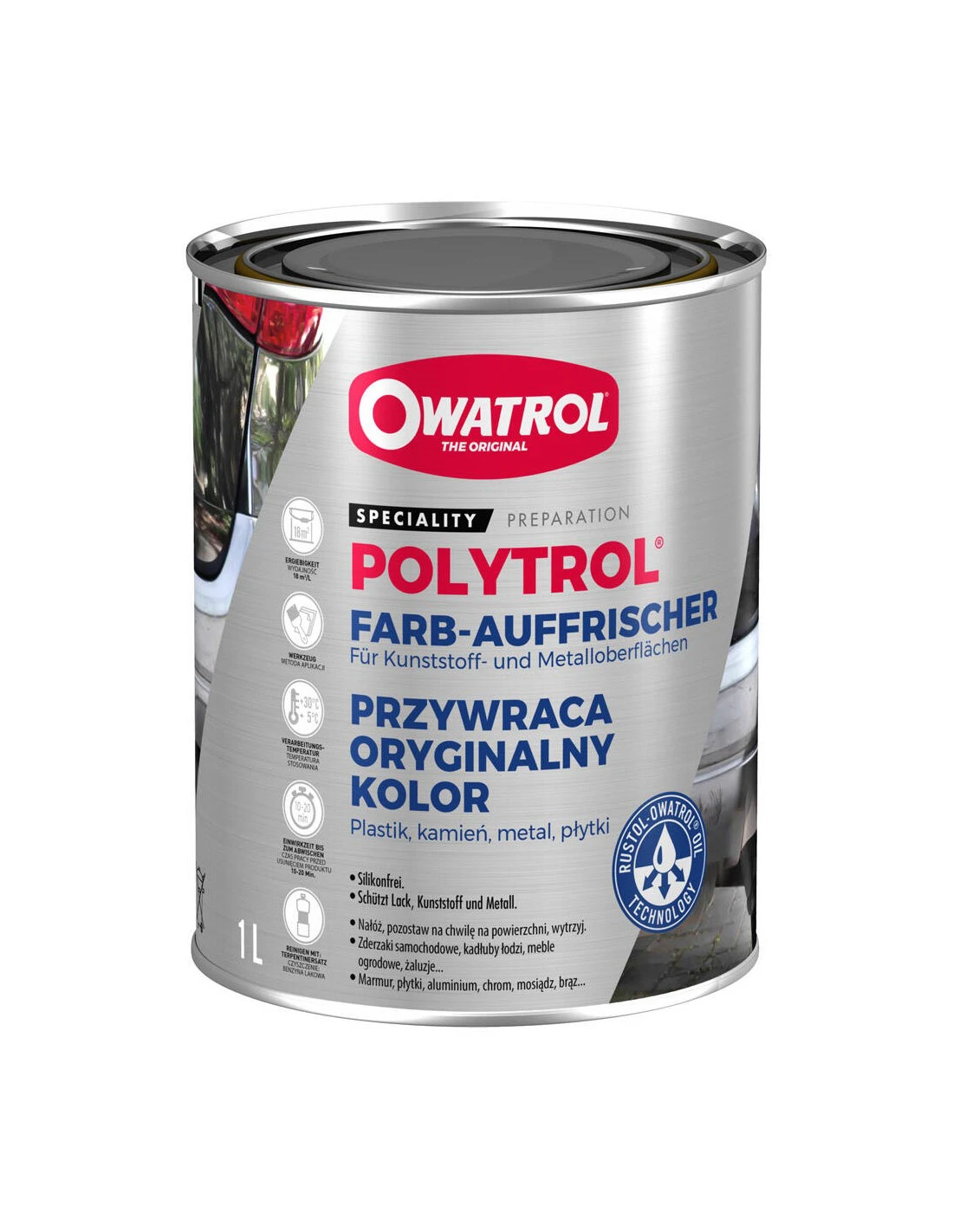 Polytrol Preparat, który odnawia wyroby z tworzyw sztucznych, polerowanych metali, marmuru czy powierzchni lakierowanych. Odnawia połysk i chroni metale polerowane i chromowane: aluminium, chrom, mosiądz, brąz, miedź, stal nierdzewną. Ożywia barwę i przywraca lśnienie wyblakłym powierzchniom z tworzyw sztucznych, włókna szklanego i gumy. Regeneruje marmury, glazurę, płyty nagrobkowe, łupki (np. dachówka), terakotę, które wyblakły w miarę upływu czasu. Dodaje blasku farbom i lakierom, które ucierpiały na skutek złych warunków atmosferycznych. Właściwości: Przywrócenie koloru zużytym, poblakłym elementom różnorodnego materiału Zawiera cząsteczki „odżywiające” pigment farb, jak i surowca – nadaje połysk Żywy metal zabezpiecza i chroni przed rdzewieniem Bez stosowania powłok woskowych i past polerujących Bez silikonu w składzie Pozostawia elastyczną, trwałą warstwę wierzchnią Proste nakładanie pierwsze jak i kolejne pielęgnacyjne Sposób użycia: Przed zastosowaniem Nawierzchnie obowiązkowo czyste, suche bez tłuszczy, jak również usunięte woski, powłoki, bejce itp.. Jeśli występował grzyb bądź pleśń – usunąć roztworem z wody i wybielacza domowego (50:50) – 10 minut od aplikacji obficie zmyć czystą wodą. Jeżeli w otoczeniu prac znajduje się roślinność – obficie ją podlać. Nawierzchnie malowane, jak też plastikowe, płytki:Użyć wody z mydłem. Starannie zmyć – czas schnięcia nie mniej niż 12godzin i zależy od powierzchni i temperatury. Nawierzchnie metalowe:Stosować ciepłą wodę z dodatkiem mydła, dobrze opłukać. Czas schnięcia minimum 12godzin. Ważne! Wyznaczać partie nawierzchni, aby czas pracy wynosił 10-20 minut Nie stosować na nawierzchniach białych Jeśli POLYTROL wchłaniany jest nierówno i pozostają matowe i błyszczące punkty, przy użyciu bawełnianej ściereczki zebrać nadmiar POLYTROLu Połysk uzyskamy gdy szmatką wypolerujemy nawierzchnię Nawierzchnie malowane, jak też plastikowe, płytki, kamień i cegła: Równo na całej nawierzchni kładziemy POLYTROL pędzlem lub ściereczką Zostawiamy na 10-20 minut do zadziałania Nadmiar POLYTROLu zdjąć czystą tkaniną Pozostawiamy do wyschnięcia Metal: Miękkim druciakiem równo rozetrzeć POLYTROL Czas działania 10-20 minut, następnie nadmiar zdjąć POLYTROL czystą szmatką Pozostawiamy do wyschnięcia Pojemność: 1000ml