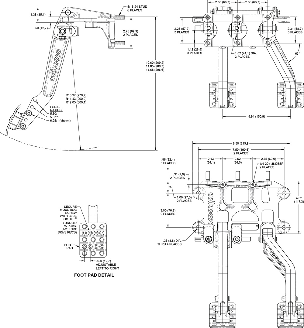 Regulowany pedał hamulca z balanserem (balance bar) i odsuniętym pedałem sprzęgła w układzie zawieszanym typu swing mount. Regulowana głowica pedału umożliwia ustawienie przełożenia 5.50:1, 5.88:1 lub 6.25:1, co pozwala na zwiększenie czucia hamulca lub zmniejszenie wymaganej siły nacisku. Przez przegrodę grodziową montowane są dwa cylindry główne hamulcowe oraz cylinder główny sprzęgła, a regulowany balanser pozwala na precyzyjną korekcję balansu hamowania przód–tył. Antypoślizgowe, radełkowane nakładki pedałów mogą być ustawiane poprzecznie w zakresie 5–7 cali dla dopasowania do preferencji kierowcy. Konstrukcja opiera się na lekkiej aluminiowej ramie oraz kutych, wzmocnionych ramionach pedalnych typu I-beam. Balanser wyposażono w mechanizm zapadkowy z wyczuwalnym zatrzaskiem co jeden pełny obrót, co zapewnia utrzymanie ustawienia; może być on również blokowany nakrętką kontrującą lub obsługiwany za pomocą opcjonalnego pokrętła zdalnego. System mocowania cięgien typu pin–clevis minimalizuje kąt niewspółosiowości, gwarantując płynny ruch w całym zakresie pracy. Zespół współpracuje z trzema pionowymi, 2.25-calowymi pompami hamulcowymi Wilwood (single outlet), dostępnymi oddzielnie w różnych konfiguracjach. Typ pedału (Pedal Type) Materiał: Aluminium Wykończenie: Czarna powłoka E-coat Opis pedału (Pedal Description) Typ montażu: Swing Kierunek montażu: Przód Balanser: Tak Długość montażowa (in): — Przełożenie i długości pedałów (Pedal Ratio & Length) Przełożenie pedału 1: 5.5–6.25:1 Przełożenie pedału 2: 5.5–6.25:1 Długość pedału 1 (in): — Długość pedału 2 (in): —