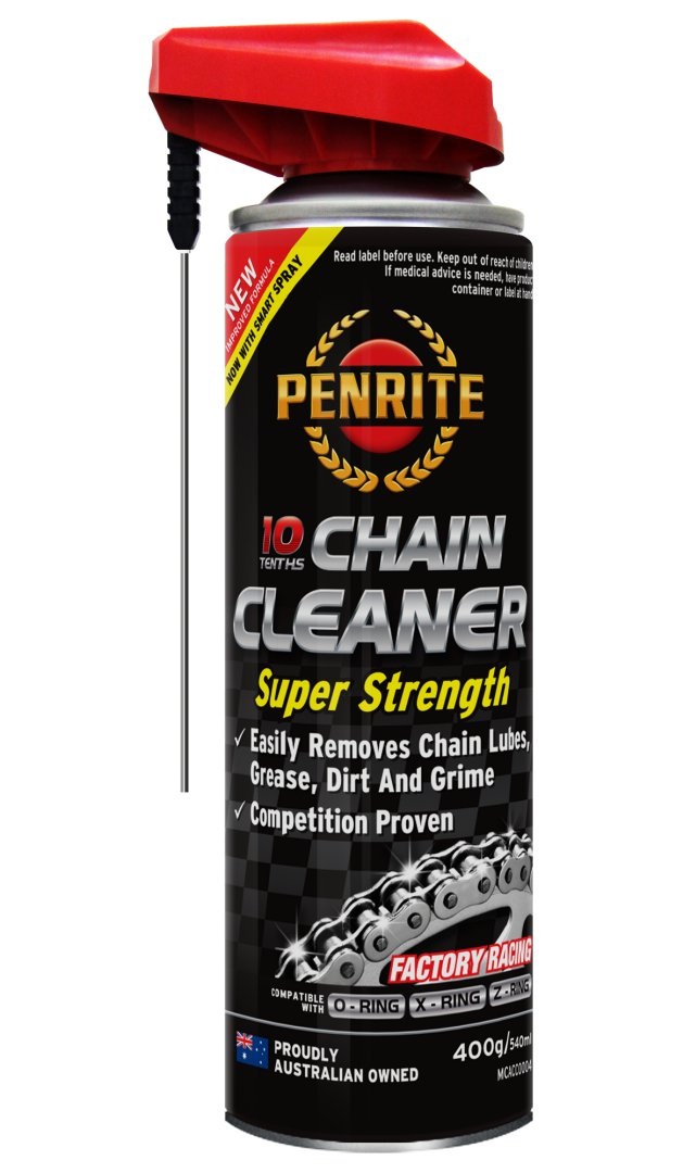 Penrite 10 Tenths Chain Cleaner 0,4L 10 Tenths Chain Cleaner is a super strength, solvent based chain cleaner that rapidly dissolves and cleans chain and sprocket dirt, sand, grime, chain grease, wax, oil silicone as well as other lubricating solids and fluids used on chain drives. Its Non-Chlorinated, Non Corrosive and Non Staining formulation is fast, effective, convenient and easier to use than conventional solvents. Fuel types Racing Benefits Competition proven by factory race teams, Economical and fast acting FACTORY RACING Penrite 10 Tenths Racing products are used by Factory Race Teams to provide the ultimate in performance and protection. APPLICATION 10 Tenths Chain Cleaner is suitable for cleaning the drive chains of motor cycles (on and off road), ATVs / Quads, Karts and other mechanical devices that use a lubricated chain drive. It can also be used on push bike chains for fast effective removal of old lubricant. It is especially effective on motorcycle chain lubricants, greases and waxes and rapidly breaks down old lubes for cleaning of the chain prior to new lubricant being applied. It may be used in standard X, O & Z-ring type chains. It is also suitable for cleaning chain sprockets, swing arms and wheel hubs. It will not harm rubbers, plastics and hoses. 10 Tenths Chain Cleaner can also be used as an effective degreaser on oil and grease from surfaces such as engine parts and other surfaces where removal of grease, oil, sludge and grime is required. It is especially suitable for all maintenance and repair work in Motor Cycle, Automotive and Marine workshops on engine parts but can also be used for cleaning of machine parts, tools and all types of equipment. INSTRUCTIONS FOR USE Lift rear wheel from the ground Place protective sheets under the cycle chain to be cleaned Spray directly onto the chain and sprocket area Allow the Chain Cleaner to penetrate, removing excess run off with a cloth For heavily soiled areas, scrub with a non-abrasive brush When clean and dried, re spray with Penrite Chain Lube Road or 10 Tenths Chain Lube Race BENEFITS Competition proven by factory race teams Economical and fast acting Easily breaks down grease, dirt and grime Non corrosive formulation Cleans parts without the need for dismantling Free from aromatic or halogenated hydrocarbons