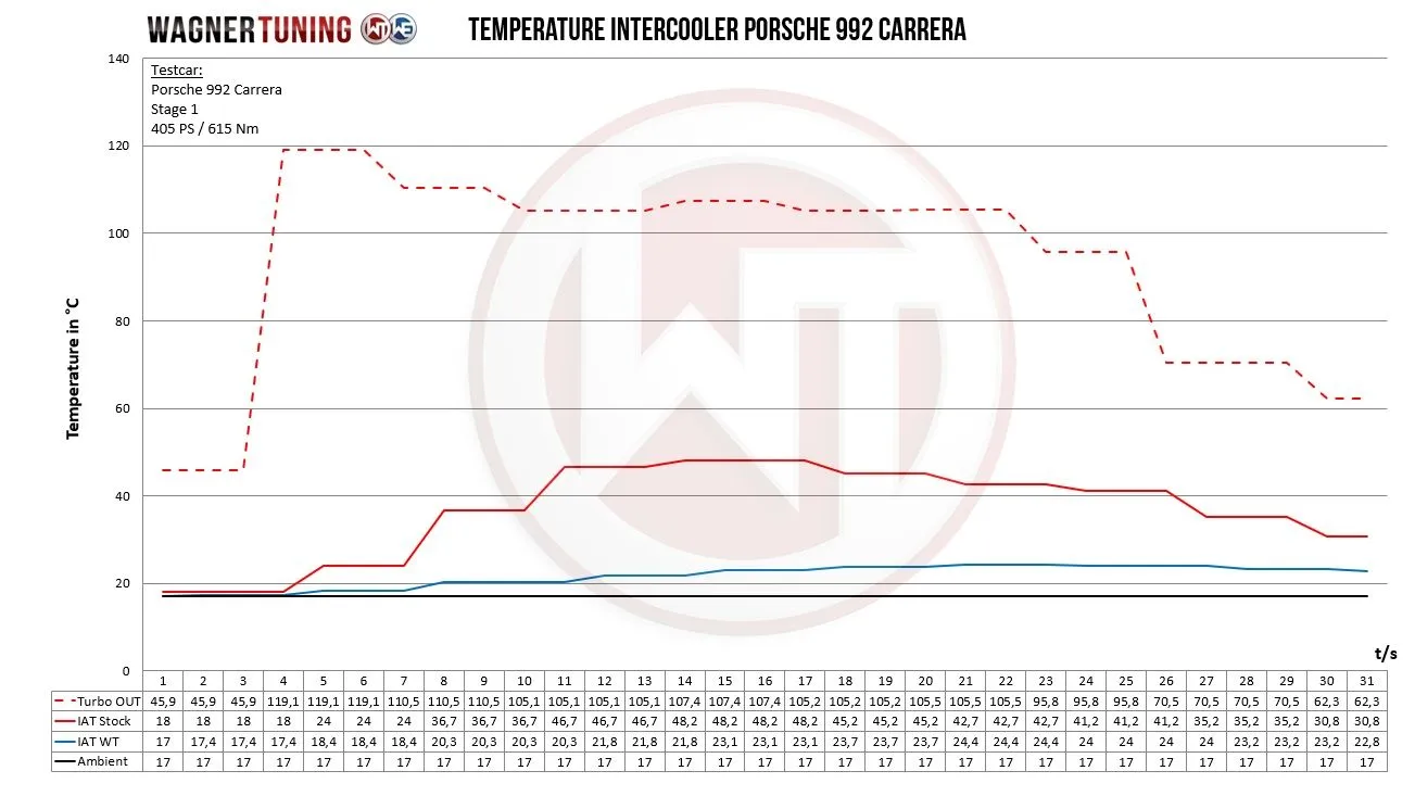 Revolutionise your vehicle's performance with our high-performance intercooler! Get ready for an upgrade that will rev up your engine. Our high performance intercoolers set new standards in terms of performance and cooling capacity. With impressive mesh dimensions of 2 x [300mm x 256mm x 115mm], our intercooler offers a whopping 88% more charge air volume compared to the original intercooler. The special high performance mesh ensures outstanding cooling properties, while the freeform cast aluminium end boxes, developed in CAD, ensure the best possible internal airflow. With an impressive pressure resistance of up to 6 bar (tested), these intercoolers are ready to withstand the toughest demands. The kit also includes 4 matching plastic air guides to ensure optimum airflow to the intercooler. All our intercoolers are equipped with a high-quality anti-corrosion coating, which not only protects against corrosion but also ensures efficient heat dissipation. The result is optimum cooling and a significant increase in performance for your engine. Installation is child's play as the kit is supplied ready to install. You can simply replace your original intercooler with our high-performance intercooler and benefit from the impressive advantages. Quality is our top priority. All our products are subject to strict quality control in order to offer you only the best. And yes, our high-performance intercoolers are also suitable for racing, for those looking for the ultimate driving experience. Put your engine in the fast lane and discover the power of our high performance intercooler. Get it now and experience performance on a new level! Performance intercooler fits to following cars:Porsche 992.1 911 Carerra 283KW/385PS (2019-)Porsche 992.1 911 Carerra S 331KW/450PS (2018-)Porsche 992.1 911 Carerra GTS 353KW/480PS (2021-)Part number: 200001196OEM intercooler:2 x [273mm x 215mm x 80mm]V = 9,4 LiterA = 1174 cm²WAGNERTUNING intercooler:2 x [300mm x 256mm x 115mm]V = 17,7 L (+88%)A = 1536 cm² (+31%)Comes with:1 intercooler4 plastic air ducts1 mounting material1 assembly instructionWeight: 20.00 kgVolume: 60.00 cm³/kg