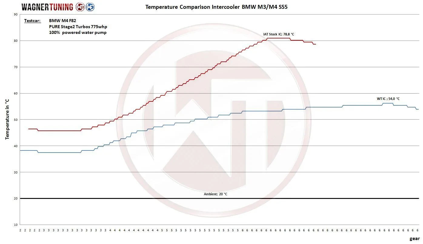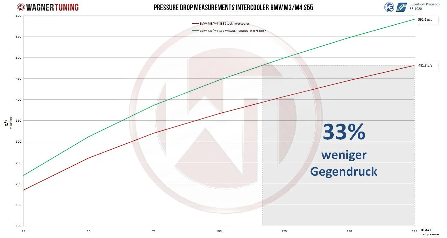 Uwolnij pełny potencjał silnika BMW S55 dzięki wysokowydajnemu intercoolerowi Wagner Tuning.Modele BMW M2 Competition, M3 i M4 z imponującym, turbodoładowanym silnikiem 3.0‑litrowym S55B30 zasługują na prawdziwą rewolucję. Nasza odpowiedź? Wysokowydajny intercooler od WagnerTuning.Nasz wysokowydajny intercooler wykorzystuje zaawansowany rdzeń chłodnicy doładowania zaprojektowany specjalnie pod wymagania silnika S55. O wymiarach 287 mm x 185 mm x 115 mm oferuje aż o 114% większą zewnętrzną objętość rdzenia w porównaniu z seryjną chłodnicą. Optymalny stosunek wewnętrznej i zewnętrznej powierzchni chłodzącej zapewnia maksymalne odprowadzanie ciepła przy zachowaniu idealnego przepływu wewnętrznego.Nasze odlewane aluminiowe komory końcowe zostały zaprojektowane w CAD i dopracowane z użyciem symulacji CFD. Efekt: znakomita wydajność chłodzenia przy minimalnych stratach ciśnienia. Ten zestaw świetnie sprawdza się w sporcie i zapewnia wyraźny wzrost osiągów. Intercoolery są pokryte przewodzącą ciepło, antykorozyjną powłoką, która gwarantuje długotrwały i optymalny efekt chłodzenia. Możesz liczyć na stałą poprawę osiągów. Montaż jest prosty dzięki szczegółowej instrukcji i zajmuje bardzo mało czasu — to prawdziwe plug and play.Uwolnij prawdziwą moc swojego silnika BMW S55. Postaw na rewolucję osiągów z wysokowydajnym intercoolerem Wagner Tuning.Zalety produktu:- znacznie lepsza wydajność chłodzenia- mniejsze straty ciśnienia- więcej mocy i momentu obrotowego- mniejsze obciążenie turbosprężarki- 100% odporności na ciśnienie- 100% plug and play- do 4 lat gwarancjiwymiary rdzenia OEM intercooler:276 mm x 136 mm x 76 mmV = 2.85 litrawymiary rdzenia Wagner Tuning intercooler:287 mm x 185 mm x 115 mmV = 6.10 litra