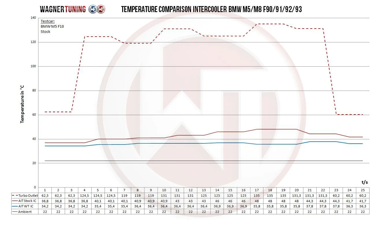 Increase the performance of your BMW M model to a new level with the Wagner Tuning high-performance intercooler!The 4.4 liter V8 biturbo engine (S63 B44T4) in the BMW M models has an indirect charge air cooling circuit in which the charge air is cooled by a water-cooled charge air cooler. With our innovative high-performance charge air cooler from Wagner Tuning, you can replace the original charge air cooler and experience an impressive increase in performance.Our high-performance intercooler has a new type of performance core measuring 192 mm x 156 mm x 128 mm. It was specially developed for the high demands of the BMW M5/M8 engine and offers an incredible 75% more external intercooler core volume compared to the standard intercooler. The optimized ratio between inner and outer cooling surface ensures maximum heat transfer and optimal internal airflow. The cast aluminum end boxes were designed using the latest CAD technology and optimized using CFD simulations. The result is outstanding cooling properties with minimal back pressure, which ensures optimal cooling of the charged air with a significant increase in performance. This kit is even ideal for demanding racing.To ensure a permanent cooling effect, all Wagner Tuning intercoolers are equipped with a heat-conducting anti-corrosion coating. The installation of the system is uncomplicated thanks to our detailed installation instructions and is done in plug & play style.Advantages of this productSignificantly improved cooling performanceMore power and torque for your engineMechanical relief of the turbochargeradditional WMI-Ports (we recommend using Part No.SP30401 from Snow Performance)100% compressive strength100% plug and playUp to 4 years guaranteeIncrease the performance of your BMW M model and experience incomparable driving dynamics with the Wagner Tuning high-performance intercooler!The Wagner Tuning Performance CHARGE AIR COOLER KIT for BMW M5/M8 F9XBMW F90 M5 441KW/600PS (2017+).BMW F90 M5 Competition 460KW/625PS (2018+)BMW F90 M5 CS 467KW/635PS (2021+)BMW F91/92/9core dimensions OEM intercooler:152 mm x 143 mm x 100 mmV = 2.19 literscore dimensions Wagner Tuning intercooler:192 mm x 156 mm x 128 mmV = 3,83 liters (+75%)Part number: 200001176Comes with:2 intercoolers5 silicone hoses air1 mounting material