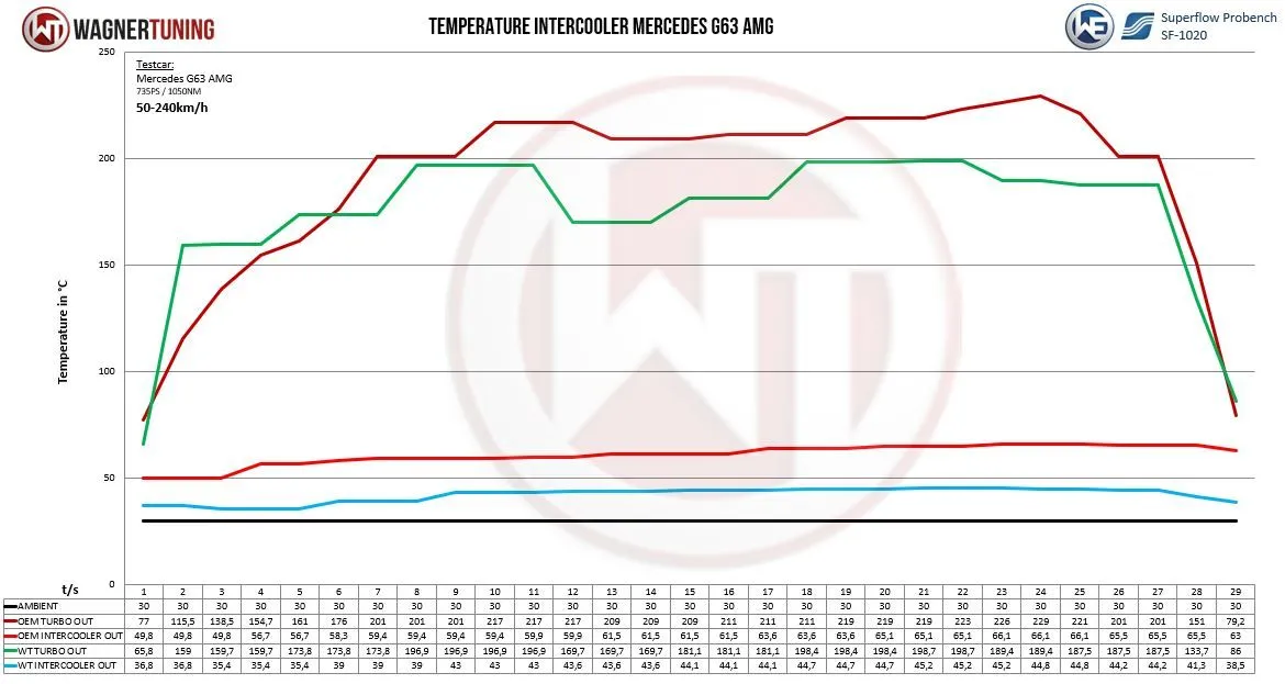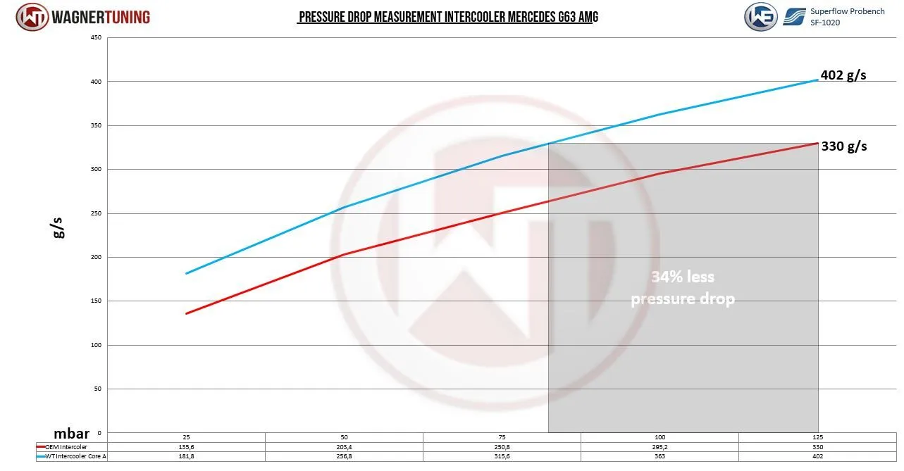 Maximize the performance of your Mercedes AMG M177 4.0 liter biturbo engine with the Wagner Tuning intercooler!Experience a revolution in performance with the groundbreaking Wagner Tuning intercooler. This innovative upgrade catapults your performance to unimagined heights and creates an unparalleled driving experience.Introducing our latest generation of high-performance intercoolers, that will take you to a new level of performance. With core dimensions measuring 430mm x 200mm x 102mm and an impressive charge air volume of 8.8 liters, these intercoolers offer an incredible 34% reduction in pressure drop compared to the stock intercooler. In the process, the specially developed high-performance core ensures superior cooling capabilities, providing unwavering support for your engine, even in the most extreme conditions.We're revolutionizing lightweight design with our intercoolers, weighing only 12.6 kg each. Crafted using CAD-developed free-form end boxes from high-quality cast aluminum, they ensure optimal internal airflow and impressive pressure resistance of up to 6 bar (tested). Our reinforced silicone hoses and aluminum charge air tube offers exceptional flow characteristics while maintaining high pressure resistance. This approach effectively minimizes back pressure, maximizing your vehicle's performance to its fullest potential. To guarantee lasting durability, each of our intercoolers is equipped with a premium anti-corrosion coating with excellent heat conduction properties. This ensures your cooling system operates at optimal levels at all times, providing you with a significant performance boost that will undoubtedly set you apart from the competition.Say goodbye to complex modifications! Our ready-to-install kit allows you to effortlessly replace the stock intercooler, saving valuable minutes on the race track. In our commitment to providing you with nothing but the best, all of our products undergo rigorous quality monitoring. If you're ready to elevate your racing experience, then choose the competition intercooler and experience the power you truly deserve!The Performance Intercooler Upgrade Kit is suitable for the following vehicles:Mercedes G63 AMG with M177 engineMercedes W436 G63 AMG 430KW/585HP as of 2018core dimensions OEM intercooler:2 x [200mm x 190mm x 67mm]V = 5,1 Lcore dimensions Wagner Tuningintercooler:1 x [430mm x 200mm x 102mm]V = 8,8 L (+72,5%)34% less backpressuremuch better cooling performancepart number: 200001207Kit comes with:1 intercooler2 silicone hoses1 mounting material1 assembly instruction Weight: 17.60 kgVolume: 43.00 cm³/kg