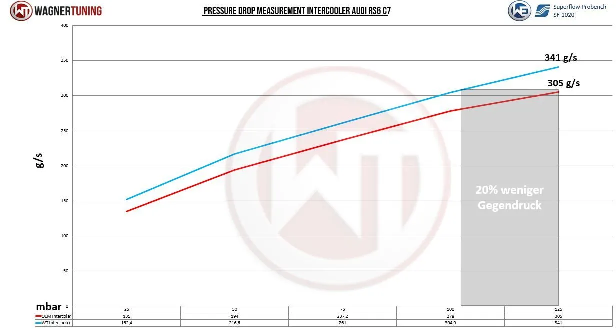 Discover the new era of performance with the Wagner Tuning Performance intercooler, developed for Audi S8 models with the powerful 4.0L V8 biturbo engine. Experience an incomparable combination of power, performance and dynamics.Our innovative intercooler has been specially developed for the demanding requirements of the Audi S8 models. It offers significantly improved cooling performance with up to 40°C cooler intake air temperatures, resulting in maximum mechanical and thermal relief for the turbocharger.With a high-quality cooling network that offers an additional 118% more external network volume compared to the charge air cooler fitted as standard, our charge air cooler sets new standards in terms of cooling performance. The ratio between the inner and outer cooling surface ensures maximum heat transfer and optimum internal air flow.CFD simulations were used to develop the end boxes from high-quality aluminum chill casting to ensure optimum air flow conditions. The result is outstanding cooling properties with minimal back pressure, which also makes this kit ideal for racing.Our intercooler is equipped with a thermally conductive anti-corrosion coating that ensures long-lasting durability. Installation of the complete kit is straightforward and plug & play thanks to our simple installation instructions.Benefit from the numerous advantages of this product:- Significantly improved cooling performance with up to 40°C cooler intake air temperatures- Maximum mechanical and thermal relief for the turbocharger- More power and torque for your engine- 100% pressure resistance- Plug-and-play without modifications- 4x 1/8 NPT connections for measuring additional parametersSuitable for all power levelsTreat yourself to the ultimate performance upgrade for your Audi S8 and experience a driving experience that will thrill you. Opt for the Wagner Tuning Performance intercooler and take your vehicle to a new level of performance and dynamics.The Wagner Tuning Performance intercooler kit is suitable for the following vehicles:Audi S8 D4 Plus 605PS/445KW 09/2015-09/2017Audi S8 D4 520PS/382KW 04/2012-09/2017Audi 4.0 TFSI D4 420PS/309KW 04/2012-08/2013Audi 4.0 TFSI D4 435PS/320KW 09/2013-09/2017Part number: 200001223 Weight: 11.50 kgVolume: 20.00 cm³/kg