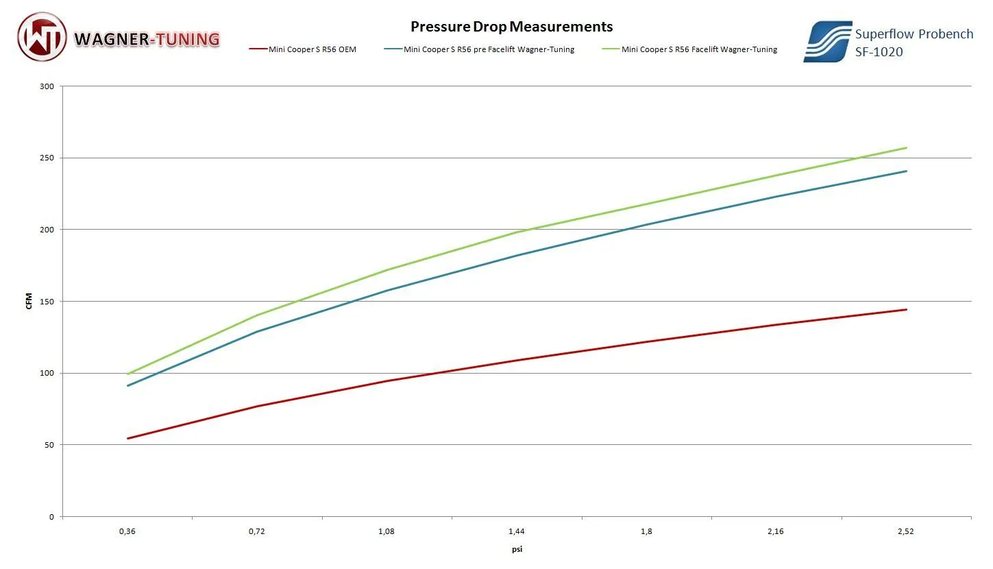 Zestaw intercoolera o wymiarach rdzenia (550 mm x 210 mm x 90 mm / schodkowy), zapewniający o 230% większą powierzchnię czołową i o 116% większą objętość w porównaniu z oryginalnym intercoolerem. Inżynierowie Wagner Tuning zwiększyli rozmiar i wydajność rdzenia intercoolera, a także ulepszyli konstrukcję boczków, aby usunąć wszelkie wąskie gardła OEM, co skutkuje zwiększonym natężeniem przepływu i poprawą chłodzenia przepływającego powietrza. Zbudowany z najwyższej jakości rdzenia Tube Fin z wewnętrznymi turbulatorami oraz w połączeniu z odlewanymi aluminiowymi boczkami zoptymalizowanymi przez CFD (dynamiczna symulacja przepływu) dla najlepszego możliwego wewnętrznego przepływu powietrza. Rezultatem są doskonałe właściwości chłodzące i znacznie mniejszy spadek ciśnienia niż w standardowym intercoolerze. Ten zestaw to najlepszy wybór, jeśli chodzi o wzrost wydajności i niskie temperatury wlotowe. Intercooler pokryty powłoką antykorozyjną o wysokim współczynniku odprowadzaniu ciepła. Zestaw kompletny i prosty w montażu dzięki idealnemu dopasowaniu. Wszystkie produkty Wagner Tuning poddawane są rygorystycznym kontrolą po procesie produkcyjnym. Zestaw Wagner Tuning Performance Intercooler Kit wykonany dla silnika Mini Cooper S pasuje do: Mini Cooper S Clubman R55 przed liftingiem (2007-2010) - w tym. Modele JCW Mini Cooper S R56 przed liftingiem (2006-2010) - w tym. Modele JCW Mini Cooper S Cabrio R57 przed Facelift (2009-2010) - w tym. Modele JCW Zestaw zawiera: -intercooler -obejmy -zestaw montażowy