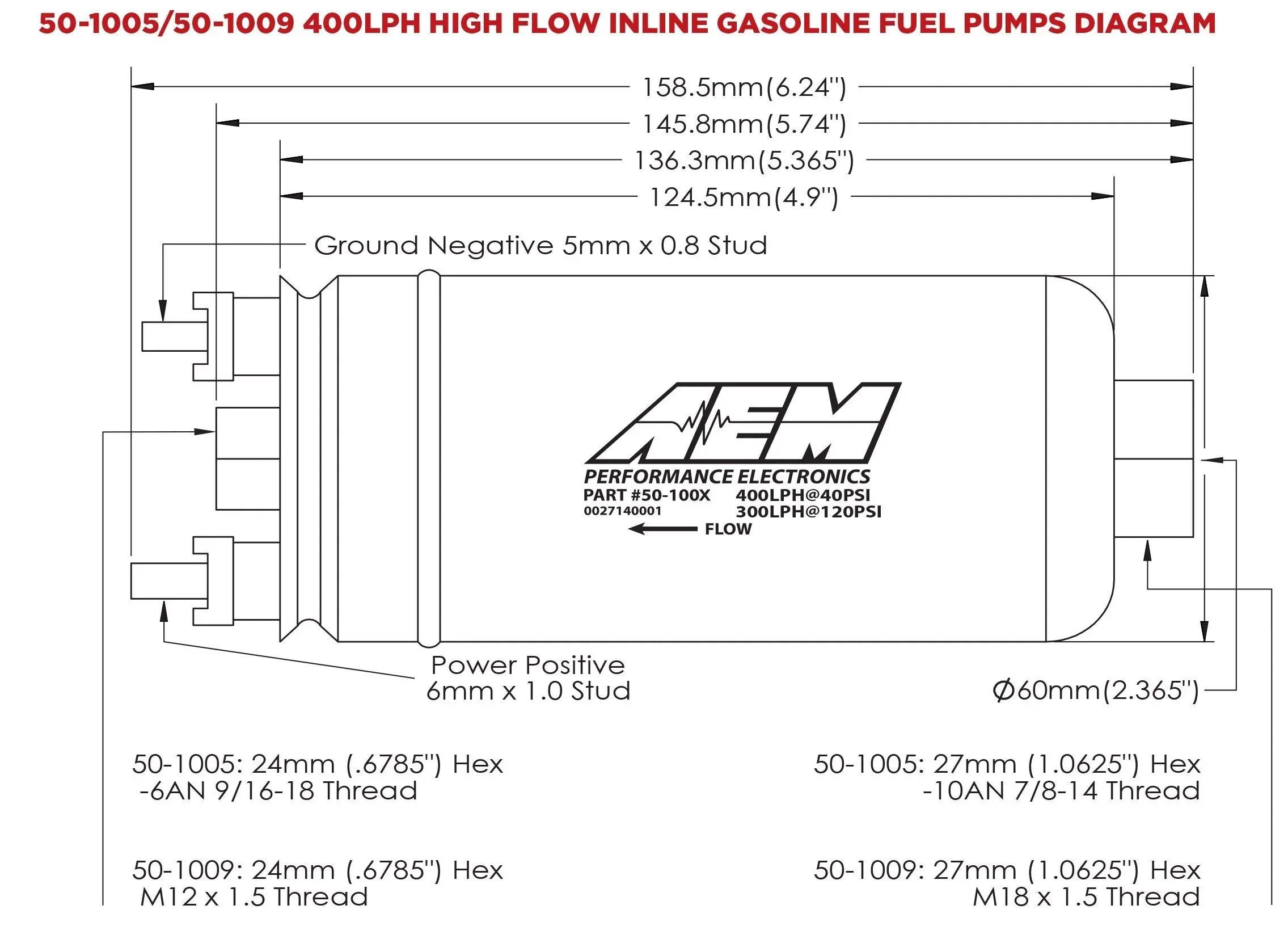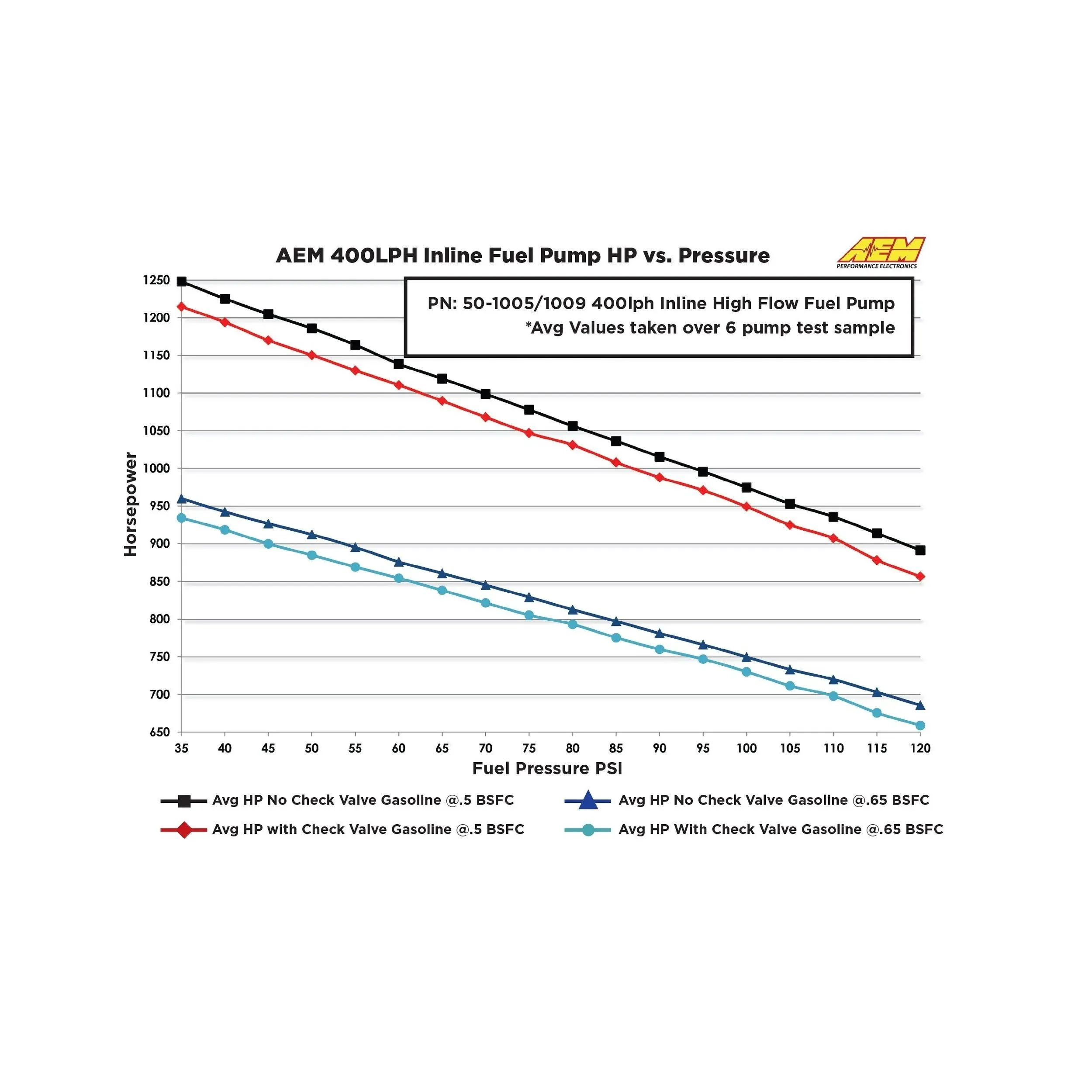 AEM 50-1009 Wysokowydajna pompa paliwa AEM 400lph. 400 lph przy 2.75 barów, 300 lph przy 8.27 barów. -10AN wlot i -6AN wylot Zestaw zawiera pompę paliwa, instrukcje instalacji, łącznik zaworu zwrotnego, końcówki / osłony / nakrętki końcówek przewodów. Pompa jest pompą uniwersalną. Wysokoprzepływowa, wysokociśnieniowa pompa paliwowa AEM (PN 50-1009) 400lph to doskonała alternatywa dla użytkowników pomp 044 , którzy potrzebują większego przepływu paliwa do swoich wyczynowych pojazdów Wysokowydajna pompa paliwowa 400lph posiada żeński wlot M18X1,5 i męski wylot M12x1,5. Wykorzystuje ona standard "044 Style". Jest ona w stanie obsłużyć ponad 1200 KM oraz 860 KM przy 2.06 barów (30 PSI). Przepływ 400 lph (105 gph) przy 2.75 barów, 340 lph (90 gph) przy 5.03 barów i 270 lph (71 gph) przy 120 PSI. Wysokoprzepływowa pompa paliwowa AEM 400lph jest przeznaczona do stosowania z paliwami mieszanymi z etanolem (E85/E90) i wszystkimi rodzajami benzyny, ale żywotność pompy zostanie zmniejszona, jeśli będzie stosowana ze 100% paliwem etanolowym. Zaprojektowana do pojazdów o wysokiej wydajności z silnikami wolnossącymi i silnikami doładowanymi. Standard "044 Style" z przyłączami metrycznymi do bezpośredniej wymiany pomp 044! Utrzymuje bardzo wysoki przepływ nawet przy zwiększonym ciśnieniu paliwa; 340 lph @ 5.03 barów (73 PSI) Każda pompa testowana indywidualnie na przepływ co najmniej 400lph (105gph) przy 2.76 barów (40 PSI) Kompatybilny z Flex Fuel (E85/E90) i wszystkimi rodzajami benzyny (100% paliwa alkoholowe mogą skrócić żywotność pompy paliwowej) Zestaw zawiera pompę paliwową, złącze zaworu zwrotnego, nakrętki zaciskowe i instrukcje *Moc znamionowa podana przy zastosowaniu benzyny i przy założeniu podstawowego ciśnienia paliwa 2.96 barów, 13,5v na pompie, 6,2 lbs/gal przy BSFC 0,65. Przyjmuje się, że ciśnienie doładowania paliwa jest równe ciśnieniu podstawowemu 2.96 barów + ciśnienie doładowania. Wydajność dla podtrzymania mocy zależy ostatecznie od średnicy przewodu paliwowego oraz napięcia i natężenia prądu w układzie. Produkty AEM objęte są 12 - miesięcznym okresem gwarancji