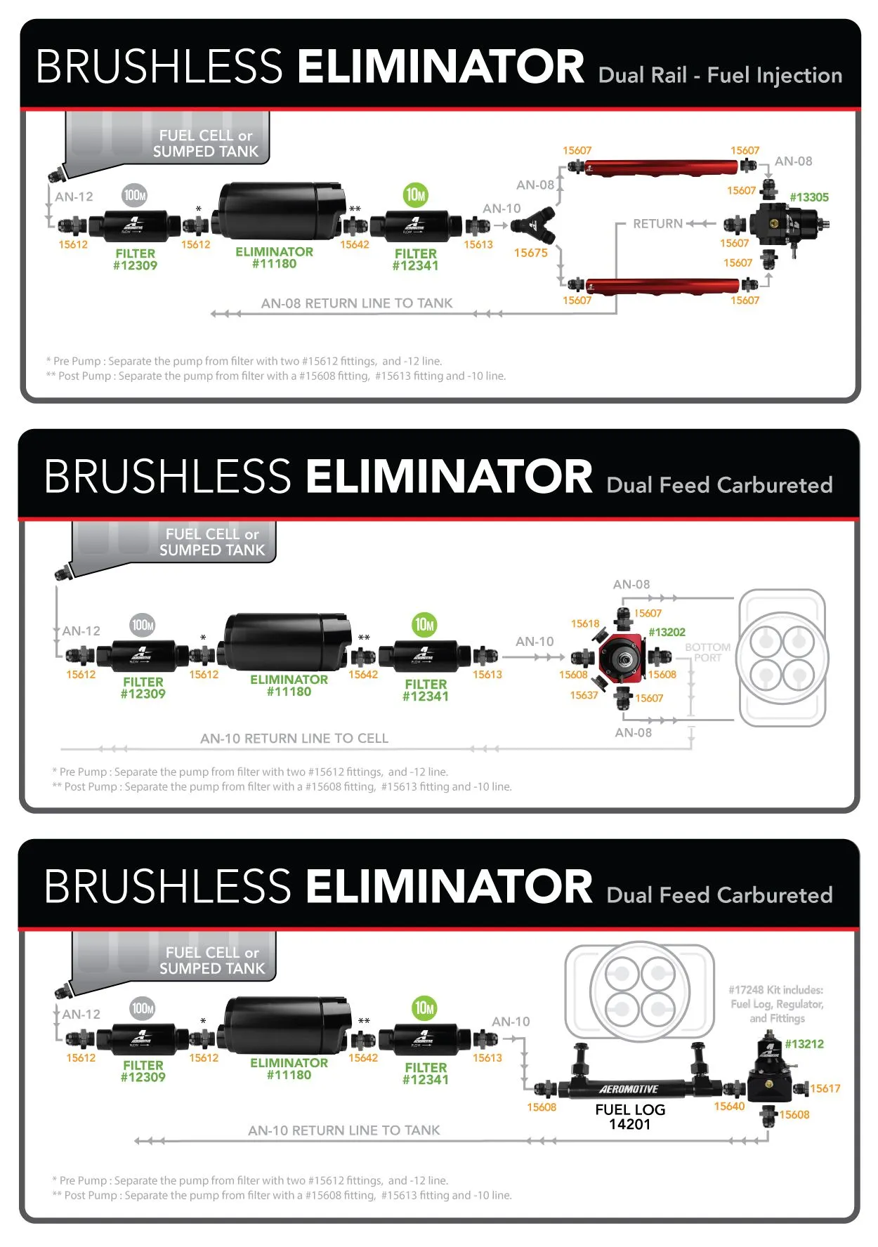 P/N 11184 Eliminator Brushless External Fuel Pump – Signature With Mounting FeetEliminator Performance Plus Advanced Technology Wydajność Eliminator, której oczekujesz, i jeszcze więcej: Fuel Injected Engines: GASdo 1900 FWHP – wolnossącedo 1400 FWHP – doładowane Carbureted Engines: GASdo 2300 FWHP – wolnossącedo 1700 FWHP – doładowane Fuel Injected Engines: E85do 1330 FWHP – wolnossącedo 980 FWHP – doładowane Carbureted Engines: E85do 1610 FWHP – wolnossącedo 1190 FWHP – doładowane Lżejsza niż tradycyjna pompa Eliminator. Niższy pobór prądu przy wyższych, ciśnieniach EFI. Wydłużona żywotność podczas pracy na metanolu i etanolu. Zintegrowany, zewnętrzny kontroler bezszczotkowy dla uporządkowanego montażu, niższej temperatury paliwa i wyższej niezawodności. Cichsza niż tradycyjna pompa Eliminator. Port wlotowy ORB-12 i port wylotowy ORB-10. Ten produkt nie jest legalny do sprzedaży ani użytkowania w pojazdach z kontrolą emisji, chyba że jest stosowany jako bezpośrednia część zamienna zgodna ze specyfikacją OEM. Wymaga stabilnego zasilania 12–16 VDC. Niezgodna z systemami modulacji impulsowej ani sterownikami prędkości pomp paliwa. Przepływ EFI: 1,000 lbs./hr przy 45 psi, 13.5 voltsPrzepływ gaźnikowy: 1,300 lbs./hr przy 9 psi, 13.5 volts