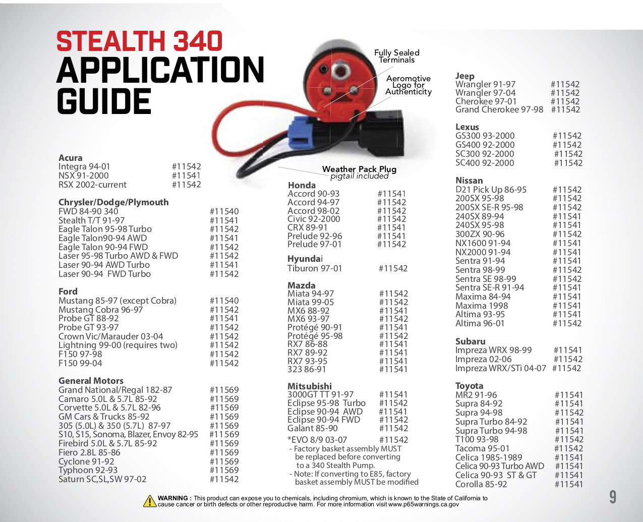 GM specific applications* The Aeromotive 340 Stealth Fuel Pump is a high-output, in-tank, electric fuel pump that fits most popular EFI applications. The Aeromotive 340 is a compact, lightweight pump that bolts into many existing hanger assemblies. (to find your vehicle, see the applications guide below) What sets the 340 Stealth Pump apart is its superior flow throughout a wide pressure range. Compared to other popular aftermarket pumps, at 40 psi the 340 boasts more than 340 lph. That’s over 30% more flow. This pump is ideal for applications requiring more flow while retaining the factory lines and mounting provisions available in the Original Equipment (O.E.) configuration. The 340 is also perfect for use as a universal replacement for applications that require more flow to support forced air power adders such as turbo and supercharged applications.