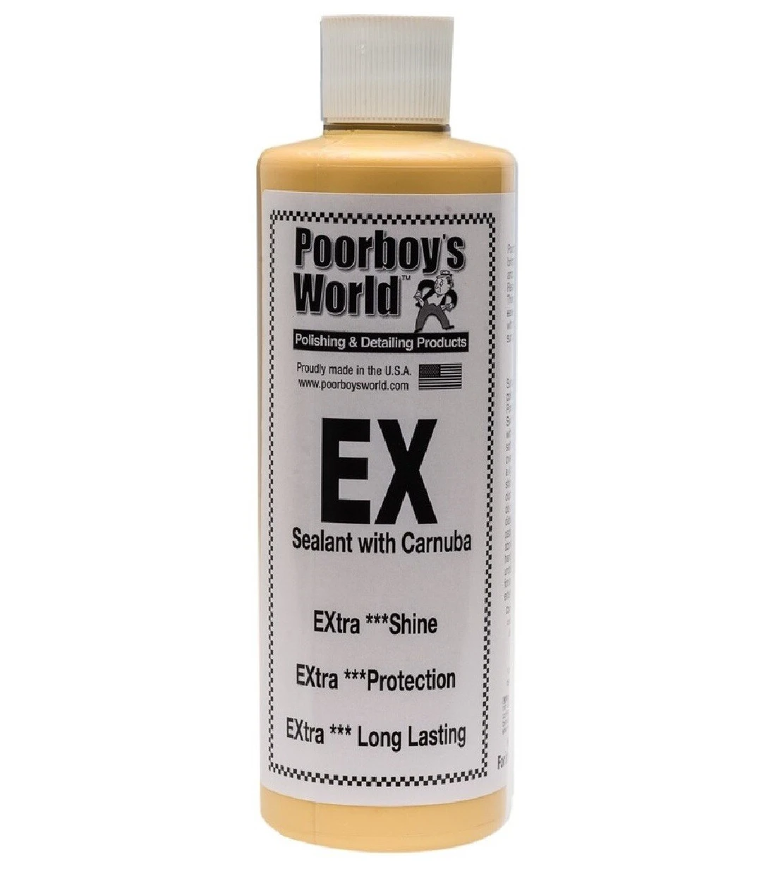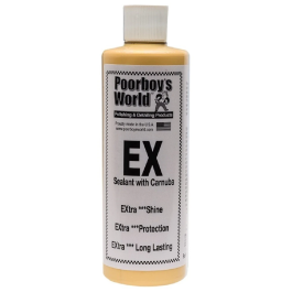 POORBOY’s EX Sealant with Carnauba to jeden z najlepszych wosków syntetycznych dostępnych na rynku profesjonalnych kosmetyków samochodowych. Bajecznie prosty w użyciu, pozwala nawet na aplikację w pełnym słońcu podczas gdy większość konkurencyjnych produktów wymaga cienia. Zapewnia doskonałe wizualnie wykończenie lakieru oraz 2-3 miesięczną ochronę po każdorazowym zastosowaniu. Tak jak inne zaawansowane technologicznie woski syntetyczne zwane hybrydami, EX zawiera naturalny wosk brazylijski Carnauba, dzięki któremu lakier zyskuje głębię koloru oraz niebywałą śliskość. Sposób użycia: Poorboy’s EX Sealant with Carnauba może być aplikowany zarówno ręcznie jak i za pomocą polerki orbitalnej. Aplikacja ręczna: Aplikować na umytą i oczyszczoną powierzchnię lakieru za pomocą aplikatura z mikrofibry. 2-3 krople produktu wystarczają na jeden element nadwozia. Dla najlepszych efektów aplikować równomierną, cienką warstwę produktu i pozostawić do wyschnięcia. Po ok. 30 minutach spolerować delikatnie ręcznikiem z mikrofibry. Aplikacja maszynowa: Aplikować na umytą i oczyszczoną powierzchnię lakieru za pomocą polerki orbitalnej i gąbki polerskiej wykończeniowej. Dwie krople o wielkości ziarna fasoli wystarczają na jeden element nadwozia. Polerować z prędkością 3000-4000 oscylacji na minutę, aż do pozostawienia na lakierze cienkiej warstwy produktu. Zostawić do wyschnięcia i po ok. 30 minutach spolerować delikatnie ręcznikiem z mikrofibry. Dostępne pojemności: 473 ml, 946 ml 473 ml