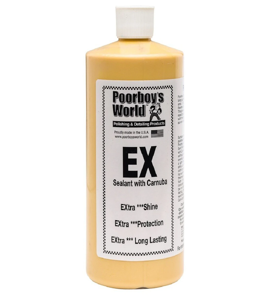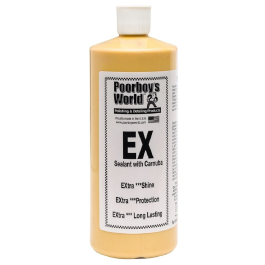 POORBOY’s EX Sealant with Carnauba to jeden z najlepszych wosków syntetycznych dostępnych na rynku profesjonalnych kosmetyków samochodowych. Bajecznie prosty w użyciu, pozwala nawet na aplikację w pełnym słońcu podczas gdy większość konkurencyjnych produktów wymaga cienia. Zapewnia doskonałe wizualnie wykończenie lakieru oraz 2-3 miesięczną ochronę po każdorazowym zastosowaniu. Tak jak inne zaawansowane technologicznie woski syntetyczne zwane hybrydami, EX zawiera naturalny wosk brazylijski Carnauba, dzięki któremu lakier zyskuje głębię koloru oraz niebywałą śliskość. Sposób użycia: Poorboy’s EX Sealant with Carnauba może być aplikowany zarówno ręcznie jak i za pomocą polerki orbitalnej. Aplikacja ręczna: Aplikować na umytą i oczyszczoną powierzchnię lakieru za pomocą aplikatura z mikrofibry. 2-3 krople produktu wystarczają na jeden element nadwozia. Dla najlepszych efektów aplikować równomierną, cienką warstwę produktu i pozostawić do wyschnięcia. Po ok. 30 minutach spolerować delikatnie ręcznikiem z mikrofibry. Aplikacja maszynowa: Aplikować na umytą i oczyszczoną powierzchnię lakieru za pomocą polerki orbitalnej i gąbki polerskiej wykończeniowej. Dwie krople o wielkości ziarna fasoli wystarczają na jeden element nadwozia. Polerować z prędkością 3000-4000 oscylacji na minutę, aż do pozostawienia na lakierze cienkiej warstwy produktu. Zostawić do wyschnięcia i po ok. 30 minutach spolerować delikatnie ręcznikiem z mikrofibry. Występuje w pojemnościach: 473 ml, 946 ml