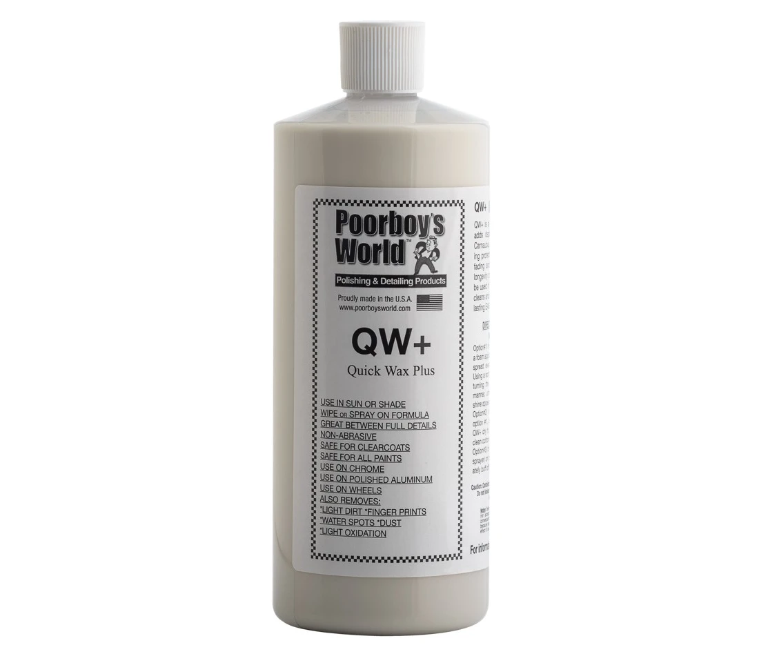 POORBOY’S Quick Wax Plus (QW+) to przysłowiowa wisienka na torcie w postaci dodatkowej porcji blasku dla każdego zadbanego automobilu. Produkt ten łączy cechy quick detailera oraz wosku płynnego. Pozwala nie tylko odświeżyć delikatnie przykurzony lakier ale także uzupełnia warstwę Carnauby i blokerów UV, przez co wydłuża ochronne właściwości wosków. Może być używany na każdej zewnętrznej powierzchni samochodu, zarówno w cieniu jak i na słońcu. Sposób użycia: Aplikacja w miejscu zacienionym Nakładaj przy pomocy aplikatora (gąbkowego lub z mikrofibry) lub miękkiego ręcznika z mikrofibry.Rozprowadź równomiernie na danej powierzchni nad którą pracujesz.Używając miękkiego ręcznika z mikrofibry wypoleruj do sucha, aż do uzyskania pożądanego efektu. Aplikacja w miejscu nasłonecznionym Nakładaj przy pomocy aplikatora (gąbkowego lub z mikrofibry) lub miękkiego ręcznika z mikrofibry.Aplikuj równomiernie na niewielkiej powierzchni.Następnie natychmiast wypoleruj przy użyciu miękkiego ręcznika z mikrofibry.Pracuj jednorazowo na pojedynczych, niewielkich sekcjach. Dostępne pojemności: 473 ml, 946 ml