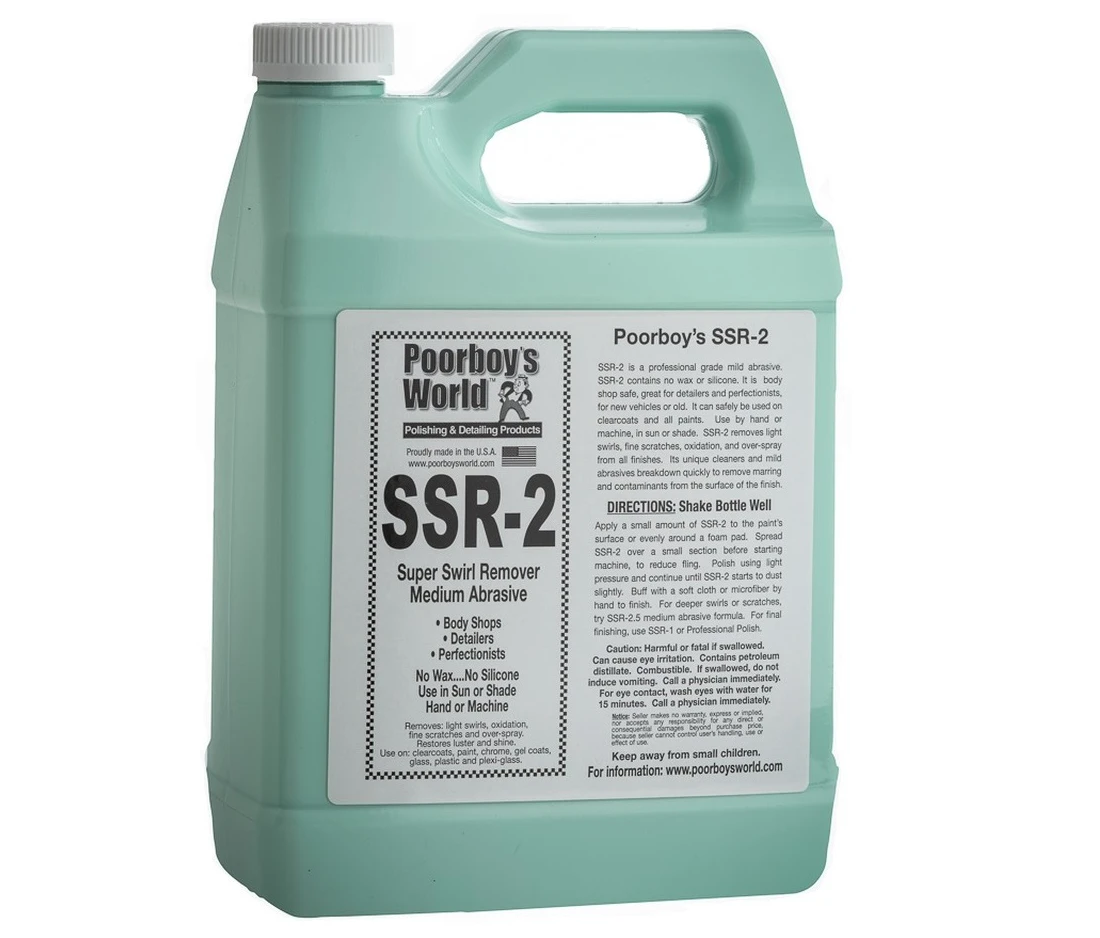 Seria past polerskich Poorboy’s Super Swirl Remover posiada recepturę, która zadowoli nawet najbardziej wymagających detaileró, lakierników oraz nowych adeptów polerowania. Każdemu ułatwią drogę do perfekcji i wolnych od rys i defektów powierzchni. Poorboy’s SSR nie zawierają wosków ani sylikonu, nadają się do użycia ręcznego (SSR1, SSR2) i maszynowego (SSR1, SSR2, SSR 2,5, SSR3). SSR1 (Light Abrasive) to pasta polerska lekko ścierna, usuwa delikatne koliste ryski, oksydację, lekkie zadrapania, odkurz lakierniczy, jest idealna do wykończenia powierzchni w procesie polerowania. Zastosowanie: lakier samochodowy, chrom, gel coats, plastik, szkło, plexi. SSR2 (Medium Abrasive) to pasta polerska średnio ścierna, usuwa delikatne koliste ryski, oksydację, lekkie zadrapania, odkurz lakierniczy. Zastosowanie: lakier samochodowy, chrom, gel coats, szkło, plexi. SSR2,5 (Medium Abrasive) to pasta polerska średnio ścierna, usuwa delikatne koliste ryski, oksydację, lekkie rysy, odkurz lakierniczy. Zastosowanie: lakier samochodowy, chrom, gel coats, szkło, plexi. SSR3 (Heavy Duty Compound) to pasta polerska mocno ścierna, usuwa delikatne koliste ryski, oksydację, większość rys, odkurz lakierniczy. Zastosowanie: lakier samochodowy, gel coats, szkło. Sposób użycia: Do stosowania ręcznego (SSR1, SSR2) – nanieś produkt na aplikator i poleruj aż do usunięcia defektów. Pozostałości pasty usuń ręcznikiem z mikrofibry. Do stosowania maszynowego (SSR1, SSR2, SSR2,5, SSR3) – poleruj za pomocą polerki orbitalnej lub rotacyjnej oraz gąbek o odpowiedniej twardości. Pozostałości pasty usuń ręcznikiem z mikrofibry. Dostępne pojemności: 473 ml 3784 ml