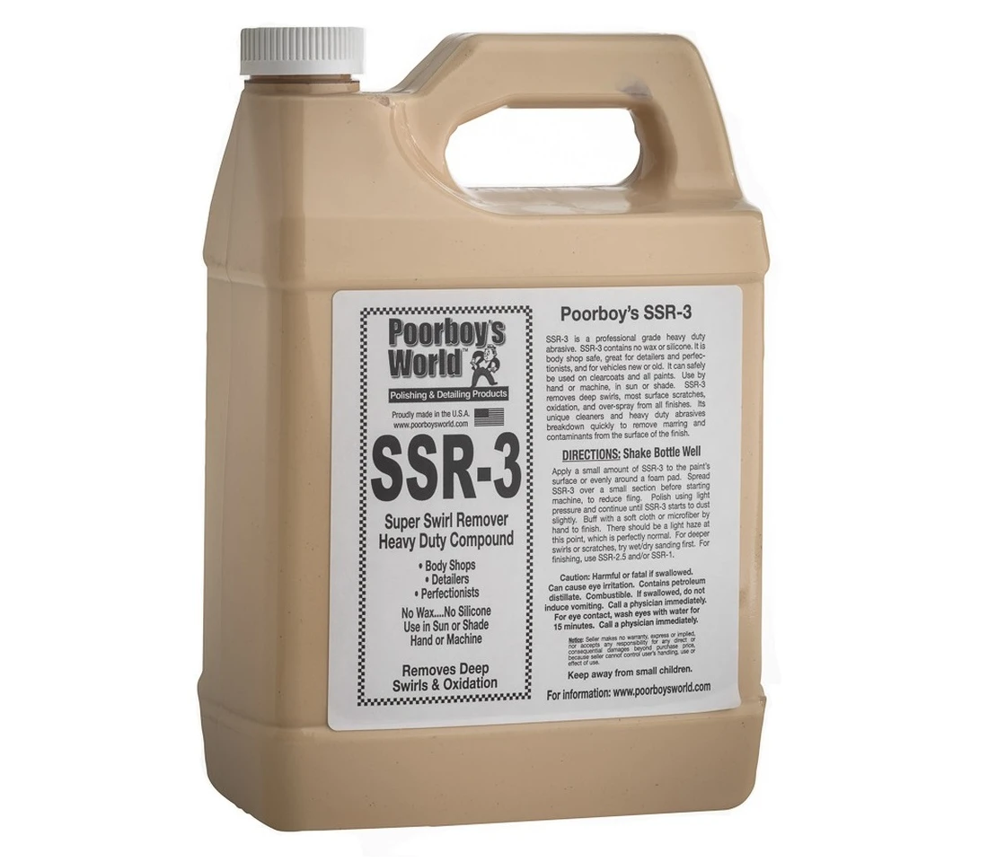 Seria past polerskich Poorboy’s Super Swirl Remover posiada recepturę, która zadowoli nawet najbardziej wymagających detaileró, lakierników oraz nowych adeptów polerowania. Każdemu ułatwią drogę do perfekcji i wolnych od rys i defektów powierzchni. Poorboy’s SSR nie zawierają wosków ani sylikonu, nadają się do użycia ręcznego (SSR1, SSR2) i maszynowego (SSR1, SSR2, SSR 2,5, SSR3). SSR1 (Light Abrasive) to pasta polerska lekko ścierna, usuwa delikatne koliste ryski, oksydację, lekkie zadrapania, odkurz lakierniczy, jest idealna do wykończenia powierzchni w procesie polerowania. Zastosowanie: lakier samochodowy, chrom, gel coats, plastik, szkło, plexi. SSR2 (Medium Abrasive) to pasta polerska średnio ścierna, usuwa delikatne koliste ryski, oksydację, lekkie zadrapania, odkurz lakierniczy. Zastosowanie: lakier samochodowy, chrom, gel coats, szkło, plexi. SSR2,5 (Medium Abrasive) to pasta polerska średnio ścierna, usuwa delikatne koliste ryski, oksydację, lekkie rysy, odkurz lakierniczy. Zastosowanie: lakier samochodowy, chrom, gel coats, szkło, plexi. SSR3 (Heavy Duty Compound) to pasta polerska mocno ścierna, usuwa delikatne koliste ryski, oksydację, większość rys, odkurz lakierniczy. Zastosowanie: lakier samochodowy, gel coats, szkło. Sposób użycia: Do stosowania ręcznego (SSR1, SSR2) – nanieś produkt na aplikator i poleruj aż do usunięcia defektów. Pozostałości pasty usuń ręcznikiem z mikrofibry. Do stosowania maszynowego (SSR1, SSR2, SSR2,5, SSR3) – poleruj za pomocą polerki orbitalnej lub rotacyjnej oraz gąbek o odpowiedniej twardości. Pozostałości pasty usuń ręcznikiem z mikrofibry. Dostępne pojemności: 473 ml 3784 ml