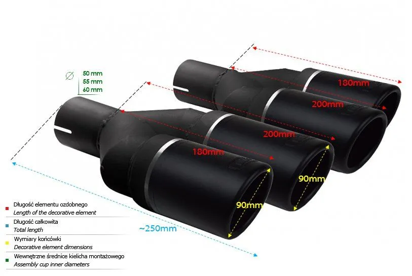 Uniwersalna końcówka tłumika okrągła długość 200/180mm średnica montażowa 55mm