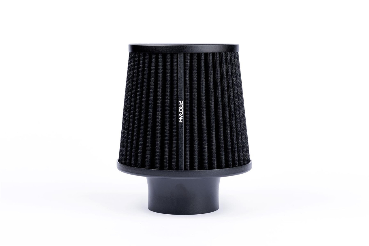 This filter comes with a silicone coupler so is designed to clamp on to the outside of a rigid hard pipe such as a MAF. These filters have an aluminium ram-pipe neck and a cone shaped filter element. This integral cone channels all the incoming air, towards the inlet manifold, and in doing so, reduces unnecessary turbulence. These filters are also cone shaped because it enables easy fitting to space restricted engine compartments and with the extremely large amount of pleated surface area an added boost of power to your engine too! These filters are made using a high quality, high flow, synthetic nanofiber filtration media which is pleated to maximise surface area and in turn increase air flow. Utilising over 35 years of experience in the field of motorsport filtration the pleated range by Ramair is the premium choice on the market today for your fast road or track car. With its large size, technologically advanced filter and bell mouth alloy spun base this filter kit is capable of handling extremely large power & flow rates. Filter Outer Neck Diameter: 89mm (3.5inch) Filter Neck Length: 45mm (1.8inch) Filter Overall Length: 185mm (7.3inch) Filter Base Width: 150mm (5.9inch) Filter Top Width: 120mm (4.7inch) Filter Material: Pleated Nanofibre Filter Base Material: Filter Base Finish: Black Powder Coat