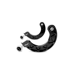 The MQB i MQB Evo-platformy samochody polegają na tłoczonej stalowej tylnej ramie zawieszenia górnego, która kontroluje kąt pochylenia tyłu. Te RacingLine tylne ramiona kontrolne do regulacji kąta pochylenia nie tylko usuwają gięcie, ale także umożliwiają precyzyjne ustawienie żądanego kąta pochylenia tyłu przez obniżone/samochody torowe. MQB i Evo-platformowe samochody polegają na tłoczonej stalowej ramie zawieszenia górnego, aby kontrolować kąt pochylenia tyłu. Te fabryczne stalenie giętane ramiona wyginają się dość znacznie podczas obciążeń, a także nie zapewniają wystarczającej regulacji, aby pozwolić obniżonym samochodom na ustawienie żądanego kąta pochylenia tyłu. Regulowane ramiona tylnego zawieszenia do regulacji kąta pochylenia RacingLine są bezpośrednią wymianą dla standardowych tłoczonych stali, miękko uszczelnionych ramion. Projekt umożliwia regulację kąta pochylenia o plus/minus 3 stopnie, oprócz tego, co pozwala na to standardowy śrubokręt ekscentryczny. Wysokie buciki gumowe o dużej twardości na każdym końcu zapewniają minimalne odkształcenie podczas ekstremalnego obciążenia torowego. Jednak bez twardości sztywnego łączenia kulowego, te ramiona są całkowicie odpowiednie do codziennego użytku ulicznego. Unikalny "Podwójny gwint" projekt RacingLine zapewnia inteligentną regulację ze stali nierdzewnej lewoskrętną i prawoskrętną dla nieskończenie precyzyjnych regulacji kąta pochylenia podczas jazdy. Większość innych ramion reguluje się tylko w zakresie 180 stopni, wymagających demontażu i ponownego montażu między każdą regulacją.