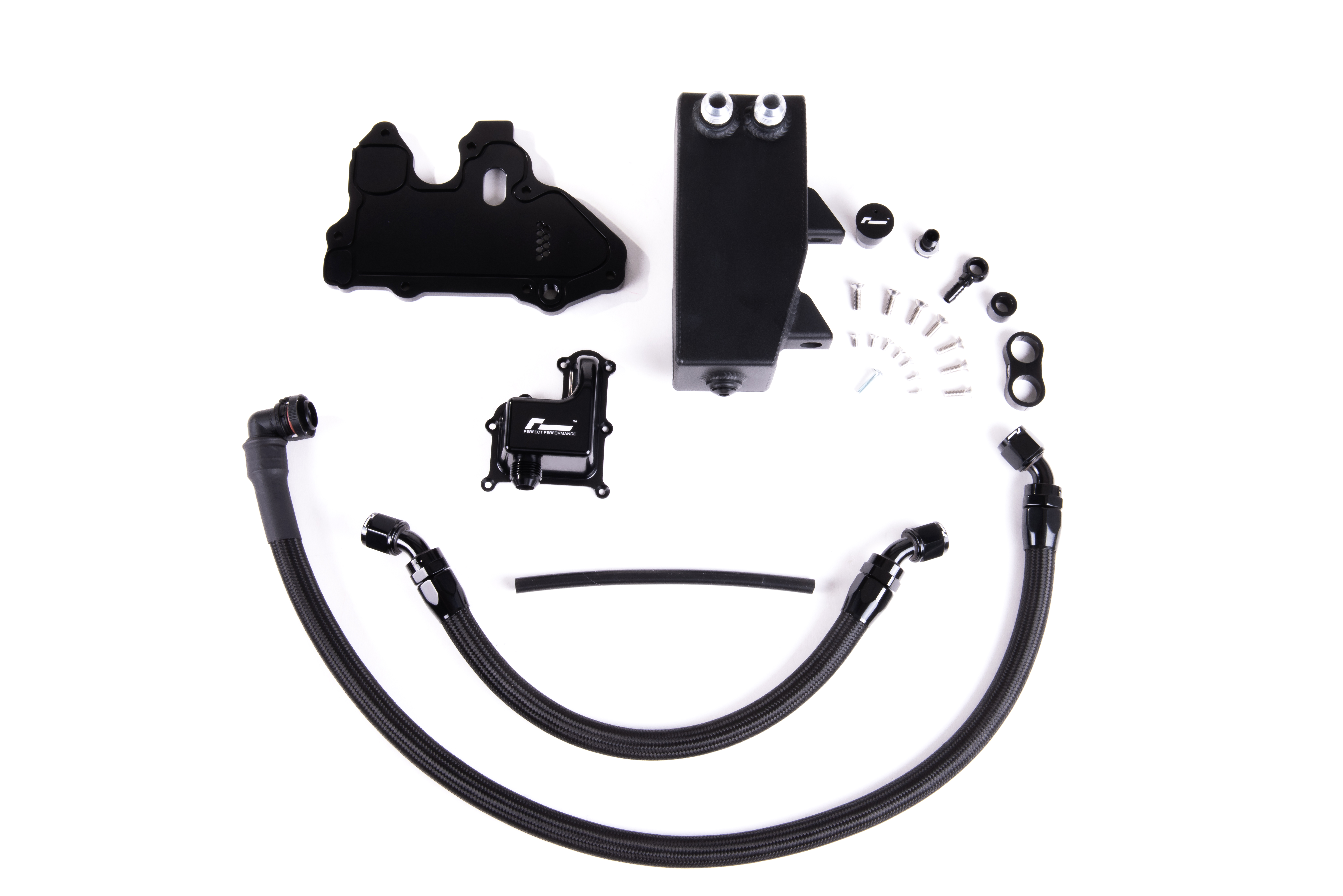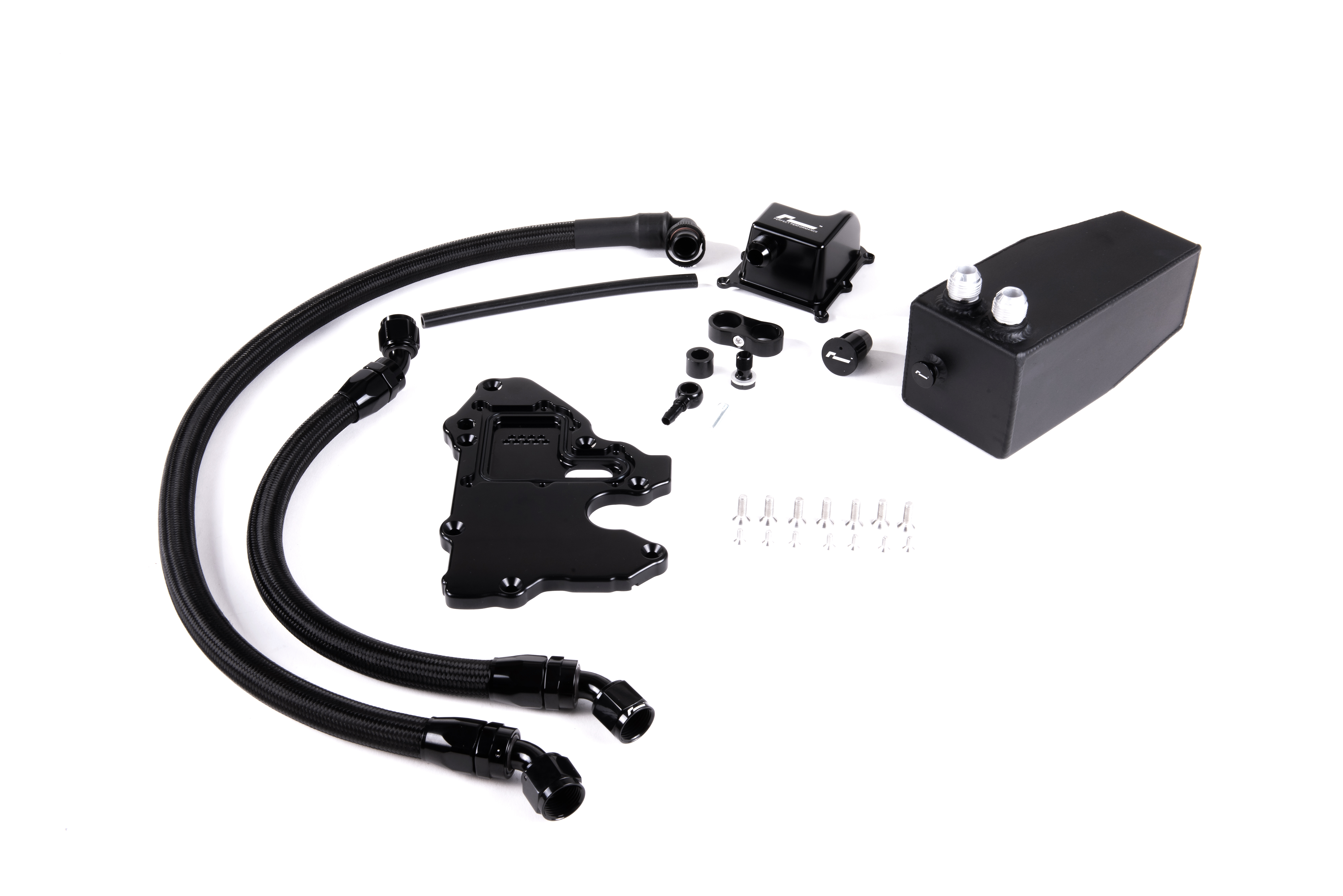 Nie wszystkie zestawy skraplacza oleju są takie same. System zarządzania olejem RacingLine został specjalnie zaprojektowany dla samochodów MQB 2.0 i 1.8 TSI bezpośrednio na bazie doświadczenia motorsportowego RacingLine - nie tylko w celu zawierania nadmiaru niepożądanego oleju i pary olejowej, ale także w celu zwalczania notorycznego problemu z przepływem oleju, który może wystąpić podczas intensywnego korzystania z toru przy wysokich G. Nie ruszaj na tor bez tego! Jeśli zamierzasz zabrać swój samochód MQB na tor, naprawdę potrzebujesz zestawu zarządzania olejem RacingLine. Bez niego ryzykujesz odcięcie oleju. Tak po prostu. Najważniejszym i najbardziej unikalnym aspektem systemu zarządzania olejem RacingLine jest to, że oferuje on właściwe rozwiązanie dla problemu odcięcia oleju podczas intensywnego hamowania przy wysokich G. Jeśli mocno napierasz swoim autem na torze, z oponami torowymi i ulepszonymi hamulcami, konstrukcja silnika 2.0 TSI EA888.3 zatrzymuje olej w górze silnika podczas długotrwałego hamowania przy wysokich siłach G. Olej gromadzi się na przodzie silnika, prowadząc do chmur dymu i ostatecznie odcięcia oleju. Aby rozwiązać ten problem, zestaw RacingLine zastępuje pełny blok PCV, dostarczając wbudowanej płyty przegrody, która zapobiega temu, aby olej podczas intensywnego hamowania nie ruszył do przodu. To właśnie ten inteligentny blok z przegrodą PCV rozwiązuje ten problem raz na zawsze. Nie jest zaskoczeniem, że RacingLine udostępnia dokładnie ten sam design zarządzania olejem dla samochodów fabrycznych Volkswagen Motorsport i Audi Sport na samochodach wyścigowych TCR. Zbiornik do zatrzymywania oleju został spawany maszynowo, aby zapewnić jak najlepsze wykończenie, a następnie pokryty charakterystyczną powłoką proszkową "krakle czarnym". Zapewniając, że zbiornik do zatrzymywania oleju RacingLine przetrwa próbę czasu i zachowa swój wygląd. System korzysta z 3-drożnego zbiornika do zatrzymywania, aby skutecznie oddzielać i zbierać nadmiar wilgoci i pary olejowej. Montaż utrzymuje intercooler i przewody dolotowe wolne od nagromadzenia się oleju i zapewnia czysty przepływ powietrza przez kolektor dolotowy. Zbiornik odłowu oleju RacingLine ma łatwy wskaźnik poziomu z wbudowaną sondą pomiarową. Kurek odpływowy na dole zbiornika ułatwia usuwanie nadmiarowych płynów. Zbiornik umieszcza się po stronie wspornika silnika i wykorzystuje oryginalny śrubunek ramy, zachowując prawdziwy wygląd OE. Uwaga: jeśli posiadasz Golf 7R i pewne wczesne modele Audi S3, mają one inny zbiornik płynu do spryskiwaczy niż inne samochody MQB. Te samochody mają zbiornik na spryskiwacze zlokalizowany po prawej stronie pojazdu - to właśnie tam będzie zamontowany Twój nowy Zbiornik Odłowu. Dlatego konieczne jest również zamontowanie zestawu zdalnego do uzupełniania płynu do spryskiwaczy RacingLine: Numer części VWR13G700RFK.
