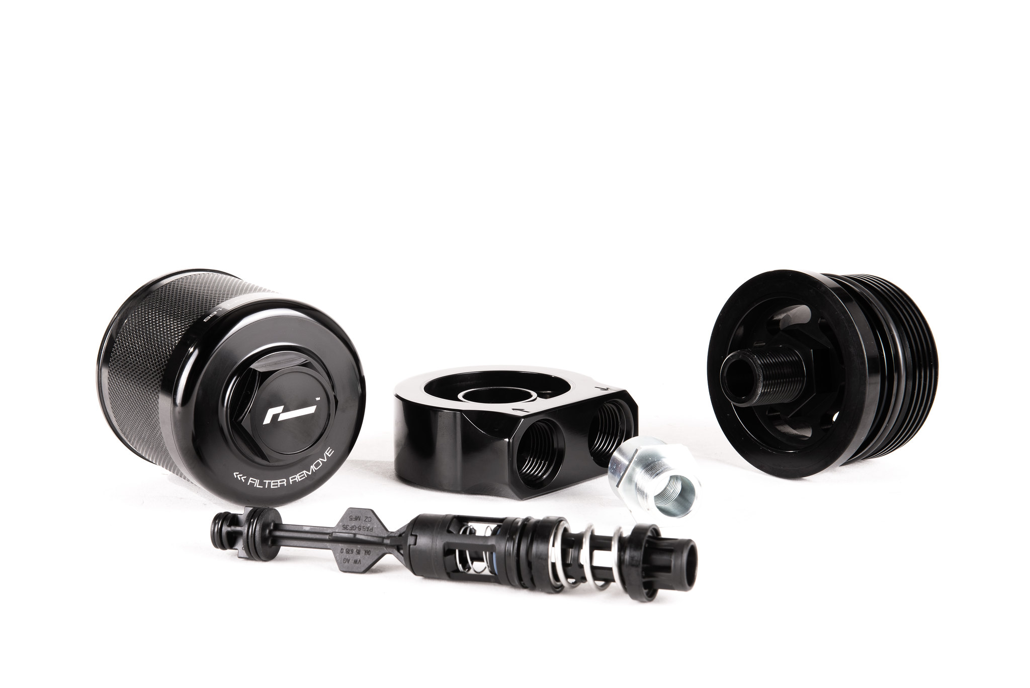 The higher your power, the harder you drive, the more important it is to protect your oil. That's why you should insist on RacingLine’s Oil Cooler Kit. Adding power to 2.0 TSI EA888.3 engines generates more heat to disperse. Significantly increased oil temperatures means only one thing: a decrease in the ability for your engine to stay properly lubricated. Under hard driving, the stock oil cooler is easily overwhelmed. Failures start to occur when oil cannot dissipate its collected heat fast enough and the oil begins to thin and degrade - losing its lubrication properties. The RacingLine kit solves this problem: by adding in an additional air to oil cooler positioned right in the airflow in the front of the car, oil temperatures are reduced by around 60° - 70° degrees fahrenheit (of course dependant on how the car is being used, ambient temps and state of tune). Unlike others, RacingLine’s kit retains the oil to water cooler that your car came from the factory with, then adds to it with this front-mounted cooler - which has the twin benefits of doubling up your oil cooling capability with less heat transfer from hot oil into the car's water system. As the oil moves away from the heat inside the engine, its temperature drops significantly as it is pumped through the densely packed fins of the 10-row cooler’s large surface area mounted right in the cool airflow. Yet at the same time, it's really important not to over-cool the oil. RacingLine’s extensive track development on this kit concluded that a 10 row stacked-plate cooler provides the ideal level of cooling ability. Whilst bigger coolers were tested, these were found to be too effective when used in conjunction with the factory cooler – dropping oil temperatures lower than the optimum for a good synthetic oil to give best engine performance. Never forget that cold oil is certainly not desirable! One of the smartest aspects of this kit is the unique sandwich plate oil take-off which includes a clever internal pressure-control valve control to direct oil flow through the cooler at correct flow/volume. This sandwich plate includes an integral pressure relief valving system to protect the system from pressure spikes. The whole system is designed with straightforward fitting and ultimate reliability in mind. Everything single part needed for perfect fitment is included in the kit. Unlike other oil cooler kits, with the RacingLine kit there is no need to remove the intake manifold to access oil galleries for a feed in and out of the engine. Instead, the clever oil filter adapter enables the oil cooler sandwich plate to be installed underneath the current oil filter housing on all EA888.3 engines - just screw off and replace. The kit includes a replacement oil filter that sits in the beautiful new billet housing. Made from a medical-grade stainless steel micronic filter cloth with magnetic pre-filtering, it’s capable of flowing 5x more oil than the factory paper filter. This filter is available to purchase separately for servicing. Whilst it is a lifetime filter, RacingLine recommend changing the filter with each oil change to ensure all contamination and ferrous particles are fully removed. As you’d expect from a RacingLine kit, it comes with beautiful, precision machined billet components utilising the latest 5 Axis CNC machines for perfect accuracy, first time, every time. All the metal parts are hand polished, then anodized in a long-lasting glossy Midnight Black finish. Laser etched logos finish off the appearance perfectly. The oil lines feature an attractive outer nylon braid strengthened by a stainless-steel inner weave for maximum resilience. A protective external sheath avoids any rubbing damage in use. The front-mount location brackets of the oil cooler radiator locate it securely in the optimum airflow and ensures that oil temperature drops and excess heat is funnelled out efficiently.