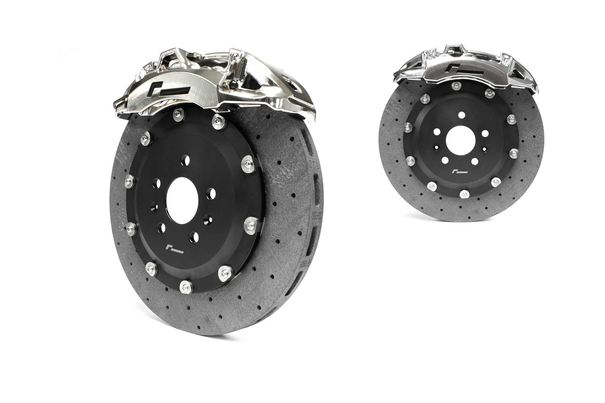 The RacingLine Stage 3+ Carbon Ceramic brake kit introduces CCM Carbon Ceramic braking technology to the MQB platform, a global first. Not only is each disc close to half the weight of the small factory disc, the kit is packed with motorsport-inspired features. Astonishing stopping performance, again and again and again. The kit features a stunning Anodized finish to the calipers plus 380mm rotors, requiring a minimum of 19” wheels for clearance. . RacingLine’s 380mm rotor construction interweaves discontinuous carbon fibre to form a 3D multi-directional matrix. Which adds up to great weight savings, performance and durability versus traditional steel brakes. Most importantly, even with the size of these CCM discs, they weigh in at nearly half the mass of the (much smaller) factory steel ones. That's a big difference to unsprung weight. With over triple the heat capacity of conventional brakes, the repeatability of the stopping power is exceptional. It's braking unlike any metal rotor kit can deliver Despite this performance capability, our Stage 3+ Carbon Kit is still perfect for daily usage, with good pedal response from cold Each stiff, lightweight Forged Monoblock caliper starts life as a one-piece ultra-strong forged billet, exquisitely finished with a complex CNC machining procedure. RacingLine’s advanced 5-axis CNC manufacturing techniques to give this kit more in common with top-level motorsport components than typical aftermarket parts. The result is a combination of ultimate track performance with lightness, stiffness and beautiful attention to detail. The result is a 6-piston caliper that is both stiffer and lighter than any other, combined with exceptional cooling characteristics and stunning detailing. The strength of this construction allows for thin-profile calipers which as well as providing extreme stiffness and light weight, aids in the all-important wheel clearance packaging. As RacingLine’s kit is engineered exclusively for VWG cars (rather than the generic calipers that others offer), they’ve invested significant development time to define piston sizes perfectly to match to VWG’s master cylinders and servos for beautiful progressive pedal response. Despite the size of these calipers, they weigh in significantly under the mass of the factory ones. The caliper, pads and bracket assembly together weigh 11.7lb (5.3kg) vs 18.9lb (8.6kg) for the stock Golf 7R / S3 equivalent. CCM-specific brake pads are included with the kit. RacingLine have thoughtfully specified a generic pad size for this kit, meaning a wide choice of alternative CCM pad brands & compounds are available if you have your personal favorite, or you're planning hard track use. This Stage 3+ Brake Kit comes with everything you need for installation: CCM rotors, calipers, mounting brackets, fast road pads, braided steel lines. Plus the option of RacingLine’s Hub Adaptors for extra wheel clearance on OEM wheels. Simply bolt on & drive for a true supercar look and feel in the braking department.