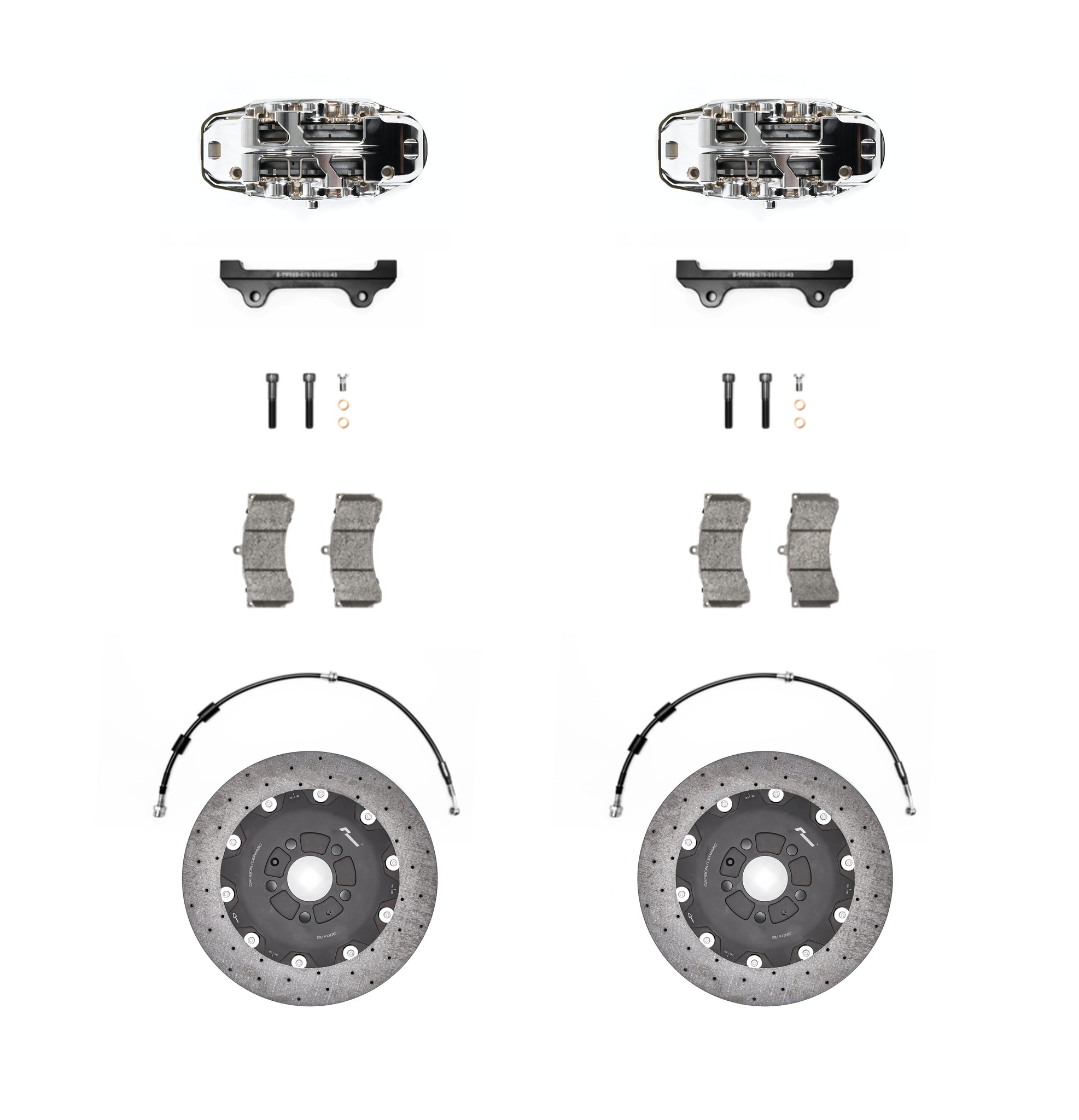 The RacingLine Stage 3+ Carbon Ceramic brake kit introduces CCM Carbon Ceramic braking technology to the MQB platform, a global first. Not only is each disc close to half the weight of the small factory disc, the kit is packed with motorsport-inspired features. Astonishing stopping performance, again and again and again. The kit features a stunning Anodized finish to the calipers plus 380mm rotors, requiring a minimum of 19” wheels for clearance. . RacingLine’s 380mm rotor construction interweaves discontinuous carbon fibre to form a 3D multi-directional matrix. Which adds up to great weight savings, performance and durability versus traditional steel brakes. Most importantly, even with the size of these CCM discs, they weigh in at nearly half the mass of the (much smaller) factory steel ones. That's a big difference to unsprung weight. With over triple the heat capacity of conventional brakes, the repeatability of the stopping power is exceptional. It's braking unlike any metal rotor kit can deliver Despite this performance capability, our Stage 3+ Carbon Kit is still perfect for daily usage, with good pedal response from cold Each stiff, lightweight Forged Monoblock caliper starts life as a one-piece ultra-strong forged billet, exquisitely finished with a complex CNC machining procedure. RacingLine’s advanced 5-axis CNC manufacturing techniques to give this kit more in common with top-level motorsport components than typical aftermarket parts. The result is a combination of ultimate track performance with lightness, stiffness and beautiful attention to detail. The result is a 6-piston caliper that is both stiffer and lighter than any other, combined with exceptional cooling characteristics and stunning detailing. The strength of this construction allows for thin-profile calipers which as well as providing extreme stiffness and light weight, aids in the all-important wheel clearance packaging. As RacingLine’s kit is engineered exclusively for VWG cars (rather than the generic calipers that others offer), they’ve invested significant development time to define piston sizes perfectly to match to VWG’s master cylinders and servos for beautiful progressive pedal response. Despite the size of these calipers, they weigh in significantly under the mass of the factory ones. The caliper, pads and bracket assembly together weigh 11.7lb (5.3kg) vs 18.9lb (8.6kg) for the stock Golf 7R / S3 equivalent. CCM-specific brake pads are included with the kit. RacingLine have thoughtfully specified a generic pad size for this kit, meaning a wide choice of alternative CCM pad brands & compounds are available if you have your personal favorite, or you're planning hard track use. This Stage 3+ Brake Kit comes with everything you need for installation: CCM rotors, calipers, mounting brackets, fast road pads, braided steel lines. Plus the option of RacingLine’s Hub Adaptors for extra wheel clearance on OEM wheels. Simply bolt on & drive for a true supercar look and feel in the braking department.