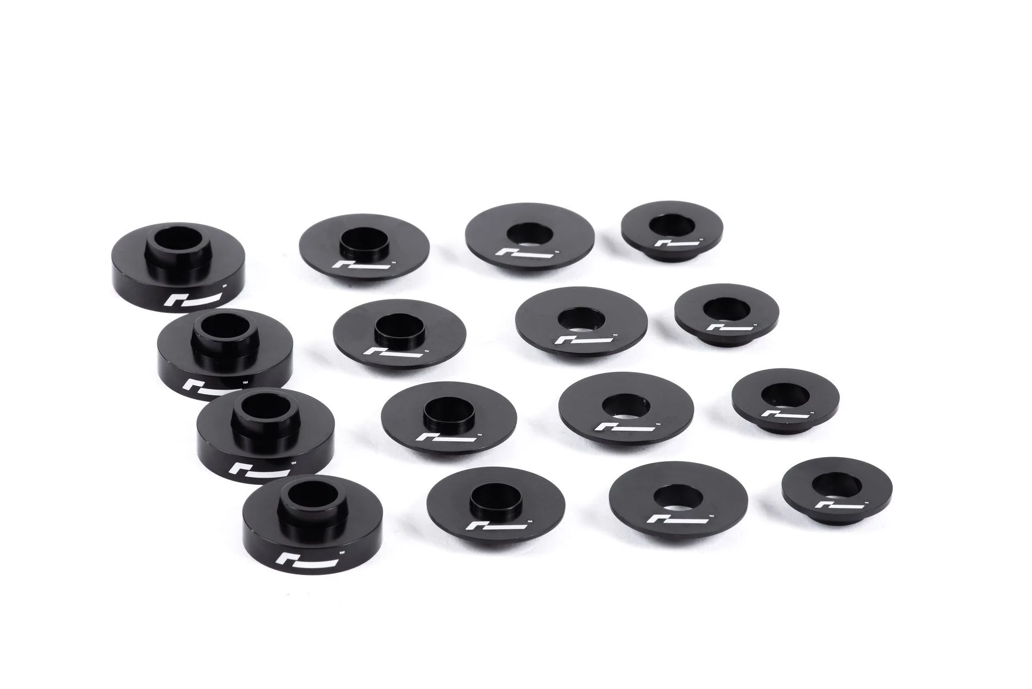 Zestaw łączników do śrub zwrotnych RacingLine MQB & MQB 'Evo' eliminuje ogromne tolerancje fabryczne w celu dokładnej regulacji każdorazowo. Pełny zestaw 16x łączników do śrub, wystarczający zarówno do przednich, jak i tylnych subram. Zestaw łączników do śrub korekcyjnych RacingLine to prosta aktualizacja 'dlaczego nie', eliminująca wyzwania wynikające z dużych tolerancji w fabrycznych mocowaniach subrama, zarówno przedniego, jak i tylnego. Prosty, szybki montaż 'wsadz-i-zapomnij' w oryginalne mocowania subrama każdego samochodu MQB. Projekt oemowskiego subrama wykorzystuje naprawdę zbyt duże otwory śrub - dając szeroki zakres regulacji, aby przesuwać cały zespół subrama do tyłu i na boki. Podczas gdy może to być idealne dla dealerów i naprawców, aby leniwie ukrywać inne nieprawidłowości w ramie, oznacza to również ogromne możliwości niedokładności za każdym razem, gdy subramy są ponownie montowane, nie wspominając o ryzyku przekroczenia tolerancji hamowania i uderzeń w czasie. Precyzyjnie wykonane na obrabiance CNC łączniki do śrub RacingLine centralizują subramy, eliminując duże tolerancje otworów, idealnie wyśrodkowując miejsca śrubowania za każdym razem, gdy znowu je instalujesz. Wykonane z wysokiej jakości aluminium T6061 billet, następnie anodowane na połysk czarny, aby wytrzymać. Rezultat? Dzięki poprawnej regulacji zachowasz precyzyjne kierowanie, ostrzejsze prowadzenie i lepszą reakcję na hamowanie za każdym razem. A dzięki zapewnieniu całkowitej dokładności za każdym razem, gdy ponownie montujesz subramy, zaoszczędzisz czas i koszty, zapewniając spójną, bezproblemową regulację za każdym razem. Bez konieczności regulacji po ponownym montażu subram, ta naprawdę przystępna cena za uaktualnienie prawdopodobnie wielokrotnie się zwróci. Brak dodatkowej transmisji NVH do samochodu i brak skrzypienia mocowań. Nie ma konieczności modyfikacji subrama ani karoserii samochodu, więc montaż jest całkowicie odwracalny.