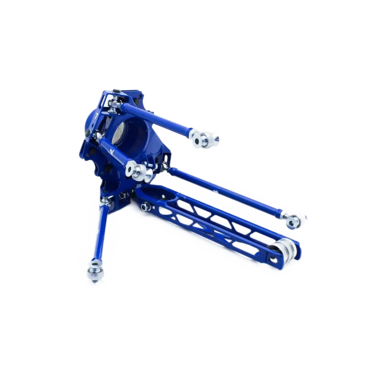 Zestaw tylnego zawieszenia Wisefab BMW F8X można zamontować w różnych modelach BMW M, takich jak F80, F82 i F87. Wszystkie metalowe elementy tylnego zawieszenia F8X wykonane są ze stali o wysokiej wytrzymałości, w tym elementy z blachy, rury, końcówki rur oraz obudowy przegubów kulowych. W celu redukcji masy i zwiększenia sztywności wszystkie cięgna zawieszenia zaprojektowano jako proste, o przekroju rurowym lub skrzynkowym. Zastosowano przeguby kulowe i łożyska sferyczne, bez gumowych tulei. Przeprojektowana kinematyka, nie tylko obniżony zwrotnik.Jeśli priorytetem jest osiągi, auto może działać lepiej przy obniżonym prześwicie, lecz wtedy fabryczna kinematyka nie funkcjonuje zgodnie z założeniami. Zestaw zapewnia prawidłową kinematykę dla obniżonego auta — wyższy roll center, poprawiony cambergain, anti-squat i bumpsteer dla maksymalnej przyczepności. Łatwa regulacja camber.Ponieważ górne cięgna są proste i rurowe, kąt camber można regulować po prostu przez zmianę ich długości. Regulacja bump steer.Możliwość regulacji bump steer poprzez zmianę położenia przegubu kulowego w szczelinie. Możliwość regulacji anti-squat.Możliwość regulacji anti-squat poprzez zmianę wysokości przedniego górnego cięgna na zwrotnicy. Można to wykonać w mniej niż 10 minut przy torze. Obniżenie cięgna zwiększa anti-squat, podniesienie je zmniejsza. Można użyć oryginalnego czujnika prędkości koła (czujnik ABS). Pasuje wyłącznie do modeli M lub tarcz hamulcowych 336 mm i większych.Mniejsze hamulce nie będą pasować. Rozmiar łożyska koła powinien wynosić 45x85x41. Zestaw zawiera: Wstępnie ustawione cięgna zawieszenia. Zwrotnice z osprzętem. Tuleje ramy pomocniczej z łożyskami sferycznymi. Inne komponenty Odległość piasta–piasta (rozstaw kół) jest taka sama jak w oryginale, ponieważ określają ją długości półosi. Zestaw zakłada użycie niższych (krótszych) sprężyn lub coiloverów w celu obniżenia auta. Możliwość zastosowania większych półosi CV. Minimalny rozmiar felgi to 17".