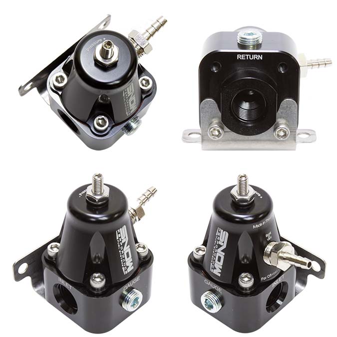 Snow Performance’s Compact Billet Fuel Pressure Regulator sets itself apart from the competition with a Fluorosilicone coated Nomex diaphragm, and all stainless steel internal components, including the regulator spring. Combine all these features with a body that is CNC-machined billet aluminum, for strength, durability, and anodized black for the ultimate in corrosion resistance. The result is a fuel pressure regulator that responds lightning fast to your vehicle’s ever-changing fuel flow demands and is compatible with any type of fuel, INCLUDING E-85 and METHANOL!