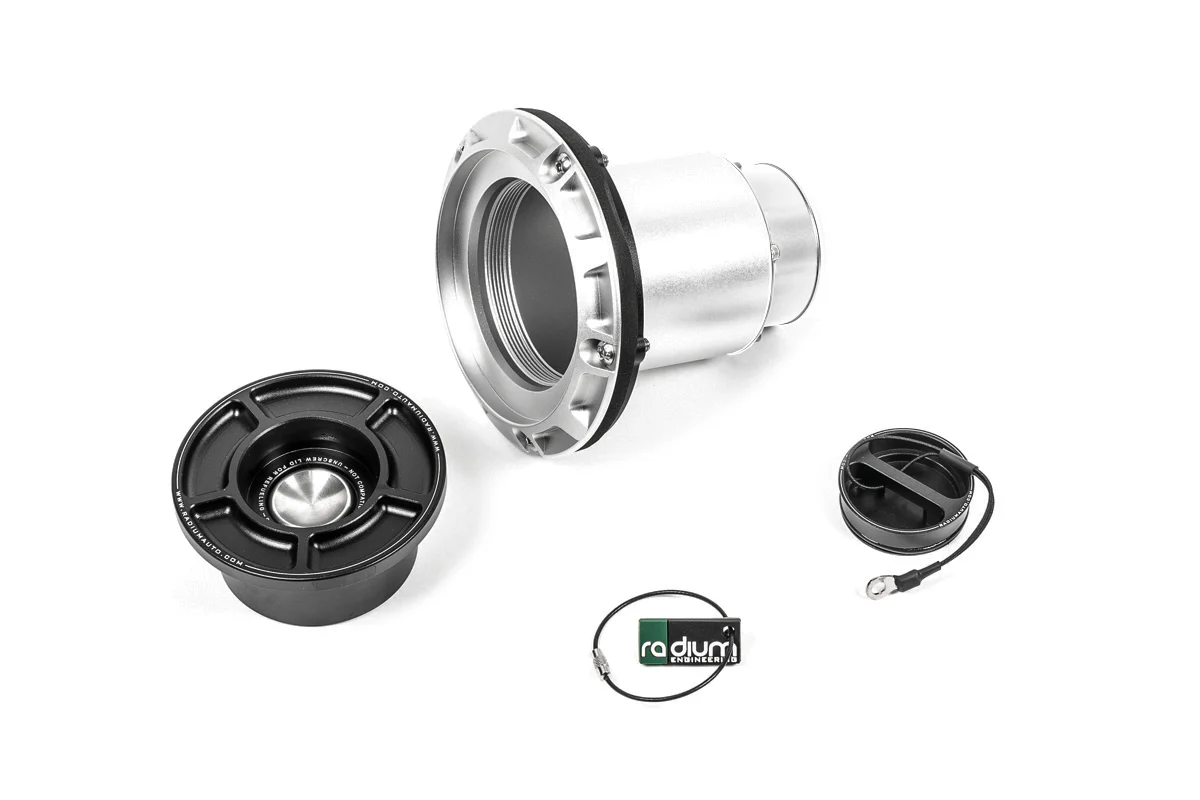 Zdalnie montowany wlew paliwa nie jest umieszczony bezpośrednio na zbiorniku paliwa ani fuel cell, lecz w innym miejscu pojazdu, na przykład na błotniku. System składa się z trzech głównych elementów: Zdalny wlew paliwa – obudowa i korek montowane na zewnętrznej części pojazdu Zdalna szyjka wlewu – połączenie typu króciec lub AN, montowane do FCST lub fuel cell Przewód wlewu – czarny lub przezroczysty przewód łączący elementy nr 1 i 2 20-1203 Remote Mount, Swing Valve Filler, 2.25″ Wlew paliwa jest zazwyczaj mocowany do karoserii pojazdu. Korek otwiera się na zawiasie, podobnie jak w fabrycznych systemach typu „capless” – nie wymaga odkręcania. Zawór obrotowy uszczelniony jest pierścieniem O-ring wykonanym z materiału FKM. Dodatkowo zastosowano wciskaną osłonę przeciwpyłową na lince, zamocowaną do kołnierza, zapewniającą szybki dostęp. Otwór o średnicy 30 mm jest wystarczająco duży zarówno dla pistoletów benzynowych, jak i diesla. Szyjka wlewu Szyjka wlewu posiada obrabiany króciec pod przewód wlewu o średnicy wewnętrznej 2,25″. Średnica zewnętrzna: 4,75″ Rozstaw śrub: 4,25″ P.C.D (5 × M5) Wysokość całkowita: 4,1″ Wymagany otwór montażowy: 77 mm (3,03″) Zawartość zestawu Korek typu swing valve Kołnierzowa szyjka wlewu pod przewód 2,25″ ID Uszczelka odporna na ozon i płomień Anodowany aluminiowy pierścień mocujący Śruby M5 ze stali nierdzewnej Elementy linki zabezpieczającej Uwagi Wykorzystuje ten sam gwint co standardowy korek oraz system dry break – elementy są w pełni wymienne Zestaw nie zawiera akcesoriów do podłączenia do zbiornika paliwa Istnieje możliwość późniejszej konwersji na system dry break przy użyciu Radium 20-0549-V
