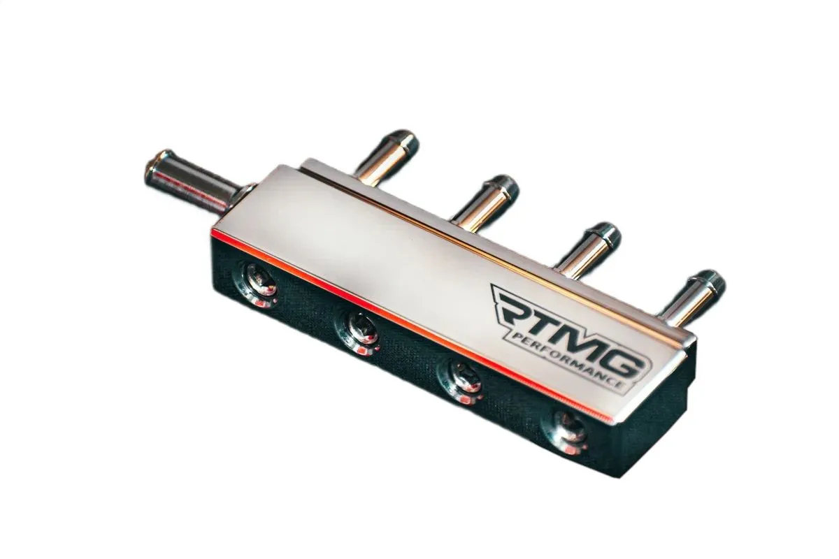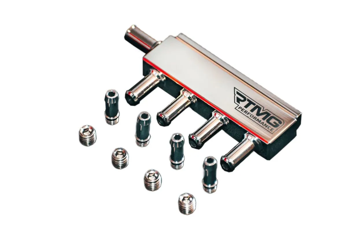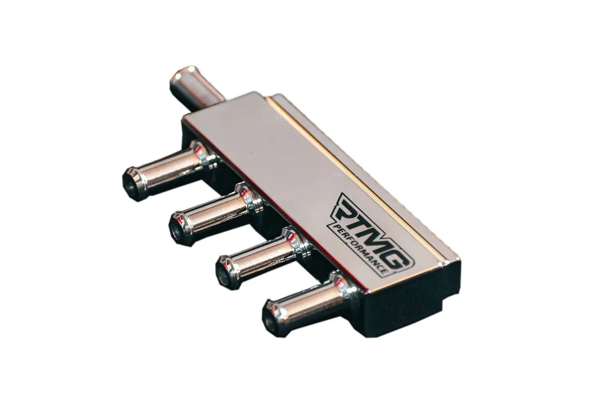 The RTMG Vacuum / Boost Splitter is a must-have tool for any car enthusiast or mechanic. This compact and versatile device allows you to easily split one vacuum or boost signal into eight separate signals, making it perfect for use in complex car engine setups. The RTMG Vacuum / Boost Splitter is made from high-quality materials and features a durable design that is built to last. It is easy to install and comes with everything you need to get started. One of the standout features of the RTMG Vacuum / Boost Splitter is its ability to distribute vacuum or boost signals evenly to all eight output ports. This ensures that each port receives the same amount of pressure, allowing you to accurately and reliably measure and control vacuum or boost levels in your car's engine. In addition to its durability and reliability, the RTMG Vacuum / Boost Splitter is also incredibly versatile. It can be used in a wide range of applications, including, wastegates, blow-off valves, and more. This makes it a valuable tool for anyone who is looking to optimize the performance of their car's engine. Overall, the RTMG Vacuum / Boost Splitter is an essential tool for anyone who is serious about maintaining and improving the performance of their car's engine. Its durable design, evenly distributed signals, and versatility make it a valuable addition to any mechanic's toolkit.
