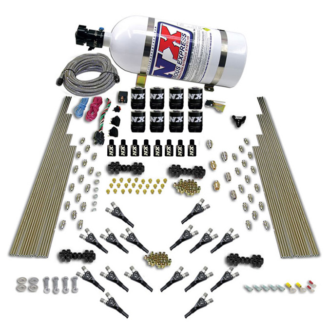 This NX Dual Stage direct port system provides the ultimate in cylinder to cylinder distribution. This system utilizes the patented NX Shark nozzles! Nitrous system comes complete with nitrous bottle, 8 aluminum / carbon fiber Lightning fuel solenoids, stainless bottle brackets, stainless hard lines, 16 nozzles, jetting, and all necessary electrical components. This system requires the drilling and tapping of intake manifold.