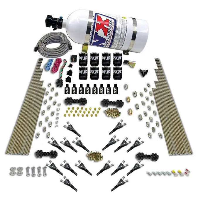 Shark Dual Stage 16 Nzls 200-1200KM Ten system bezpośredniego podawania dwustopniowego NX zapewnia ostateczne rozłożenie cylindra do cylindra. Ten system wykorzystuje opatentowane dysze NX Shark! System z azotanem jest kompletny, z butlą z azotem, 8 aluminiowymi / węglowymi elektrozaworami paliwowymi Lightning, stalowymi uchwytami na butlę, stalowymi liniami twardymi, 16 dyszami, ustawieniami dysz, i wszystkimi niezbędnymi elementami elektrycznymi. Ten system wymaga wiercenia i gwintowania kolektora dolotowego. Ten system zawiera najnowocześniejszą technologię i najlepsze dostępne komponenty. Dla wszystkich technologicznych maniaków zapewniamy kilka szczegółów, wyjaśniających, co sprawia, że ten system z azotanem jest tak świetny. Kluczem do maksymalizacji mocy azotowej jest utrzymanie azotu w gęstej formie ciekłej, aż do wstrzyknięcia do silnika. Ostre zakręty w ścieżce przepływu azotowego powodują, że przepływ azotowy staje się burzliwy, co powoduje powstawanie pęcherzy gazowych w przepływającym azocie. Gęsty ciekły azot robi więcej mocy niż gazowy azot, punkt! Ten system azotanowy NX zawiera kluczowe składniki, które zapewniają maksymalną moc na funt użytego azotu. Czytaj dalej, a wytłumaczymy. Elektrozawory NX Lightning mają ulepszoną ścieżkę przepływu, która pozwala azotowi / paliwu wpływać powyżej zaworu i wypływać na dole, zapewniając przepływ niezrównany przez żaden inny elektrozawór na rynku. Elektrozawory azotowe Lightning posiadają zintegrowane gniazdo spustowe, które pozwala na bezpośrednie podłączenie zaworu spustowego bezpośrednio do korpusu elektrozaworu azotanowego. Opróżnianie przez korpus elektrozaworu eliminuje kieszeń powietrzną między zaworem spustowym i otworem elektrozaworu. Elektrozawory paliwowe Lightning posiadają port obwodowy na paliwo, który pozwala podłączyć małą linię powrotną do zbiornika. Eliminuje to uwięziony powietrze między regulatorem ciśnienia paliwa a elektrozaworem paliwowym, co eliminuje chudnięcie związane z innymi elektrozaworami. Seria Lightning elektrozaworów posiada korpusy z aluminium CNC zakończone puszkami z włókna węglowego dla ostatecznej oszczędności wagi. Nitrous Express używa tylko najwyższej jakości, wykonanych w USA komponentów w swoich elektrozaworach. Nie daj się zwieść niskiej cenie, elektrozawory są najważniejszym elementem systemu azotanowego. Aluminiowy zawór butlowy Lightning 500 nie tylko wygląda świetnie; jest wypełniony funkcjami, w tym zintegrowanym portem na manometr, zintegrowanym portem popychacza, dużym otworem o średnicy 0,500 oraz bezpośrednią ścieżką przepływu. Butla Lightning 500 dobrze przepływa i waży niemal jedno pełne funt mniej niż nasz stary zawór NX 45. BUTLA Z NITRO JEST PUSTA!
