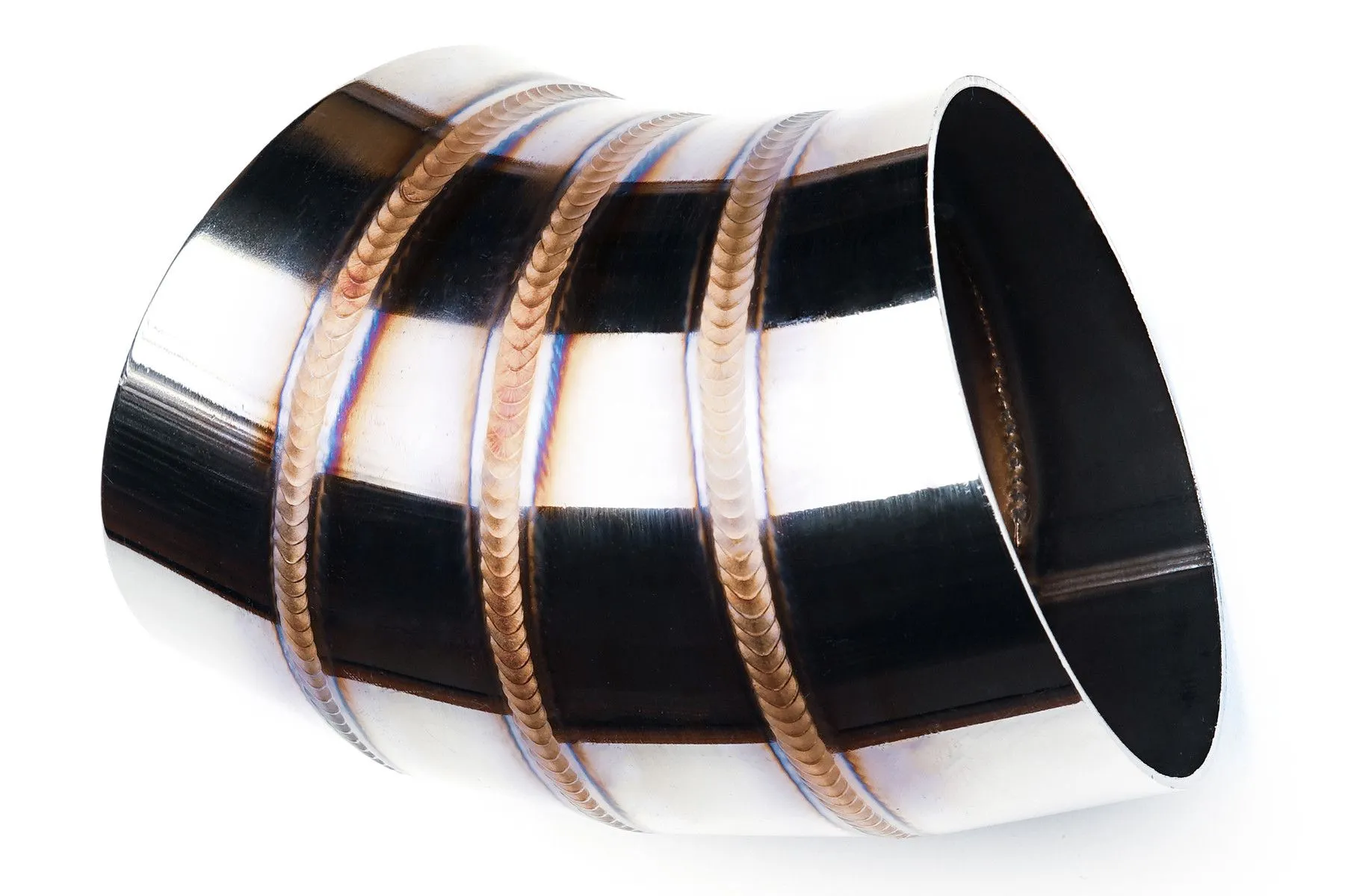 Kolanko nierdzewne z serii "welding porn" o średnicy 51mm i kącie 45 stopni. Artystycznie, ręcznie spawane w komorze argonowej, zachwycają swoim wyglądem – pięknymi, kolorowymi spawami, jak i niezwykle precyzyjnym wykonaniem. Nierdzewne "plastry" cięte na maszynie CNC pod kątem 11,25', są ze sobą idealnie spasowane - bez zadziorów, uskoków itd, tworzą idealny przelot. Wykończenie w wysokim połysku w połączeniu z kolorowymi spawami gwarantują niesamowity efekt wizualny. Kolanka wykonane są ze stali nierdzewnej 304 – można je stosować zarówno w układzie wydechowym, jak i dolotowym.