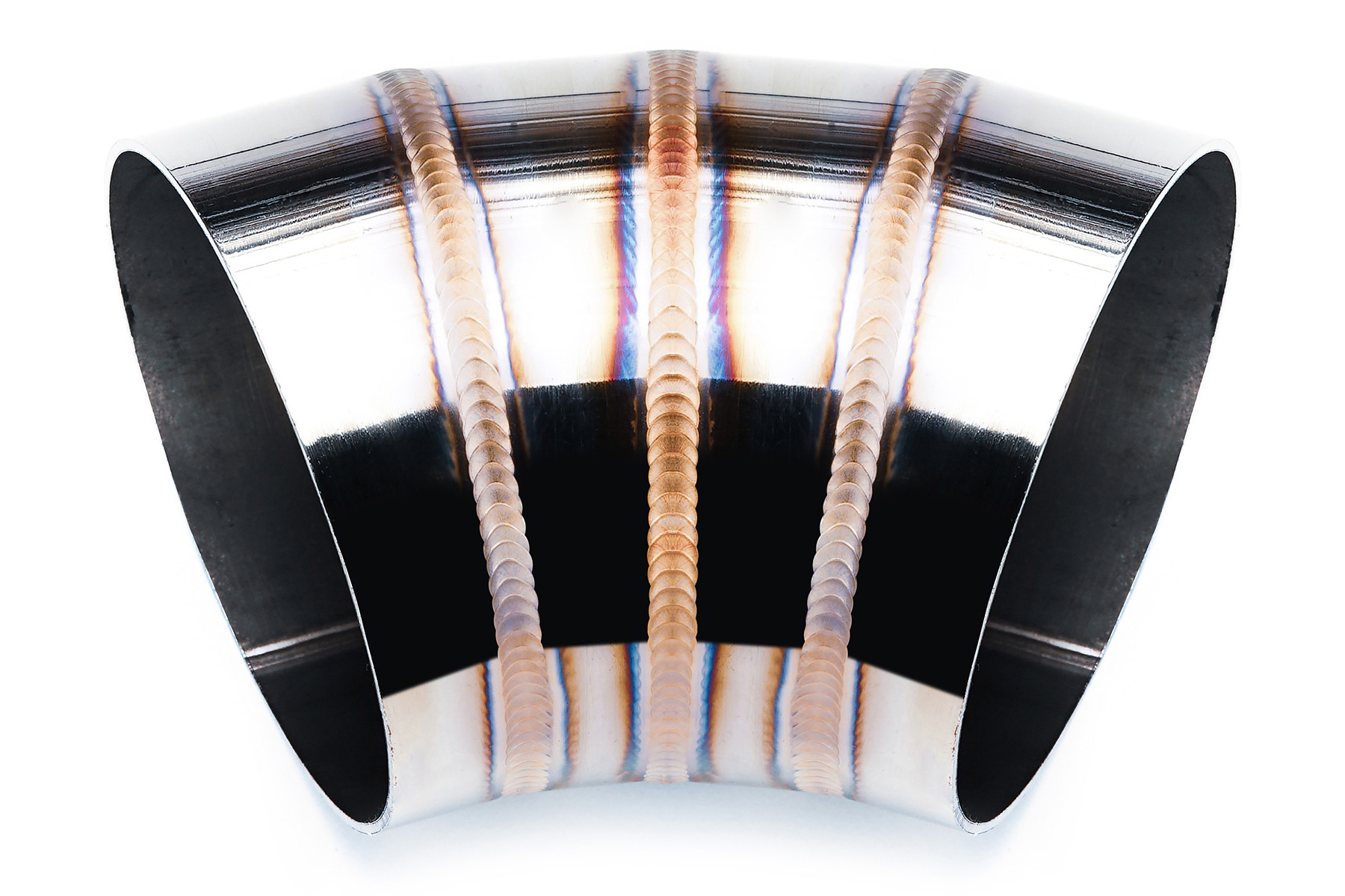 Kolanko nierdzewne z serii "welding porn" o średnicy 70mm i kącie 45 stopni. Artystycznie, ręcznie spawane w komorze argonowej, zachwycają swoim wyglądem – pięknymi, kolorowymi spawami, jak i niezwykle precyzyjnym wykonaniem. Nierdzewne "plastry" cięte na maszynie CNC pod kątem 11,25', są ze sobą idealnie spasowane - bez zadziorów, uskoków itd, tworzą idealny przelot. Wykończenie w wysokim połysku w połączeniu z kolorowymi spawami gwarantują niesamowity efekt wizualny. Kolanka wykonane są ze stali nierdzewnej 304 – można je stosować zarówno w układzie wydechowym, jak i dolotowym.