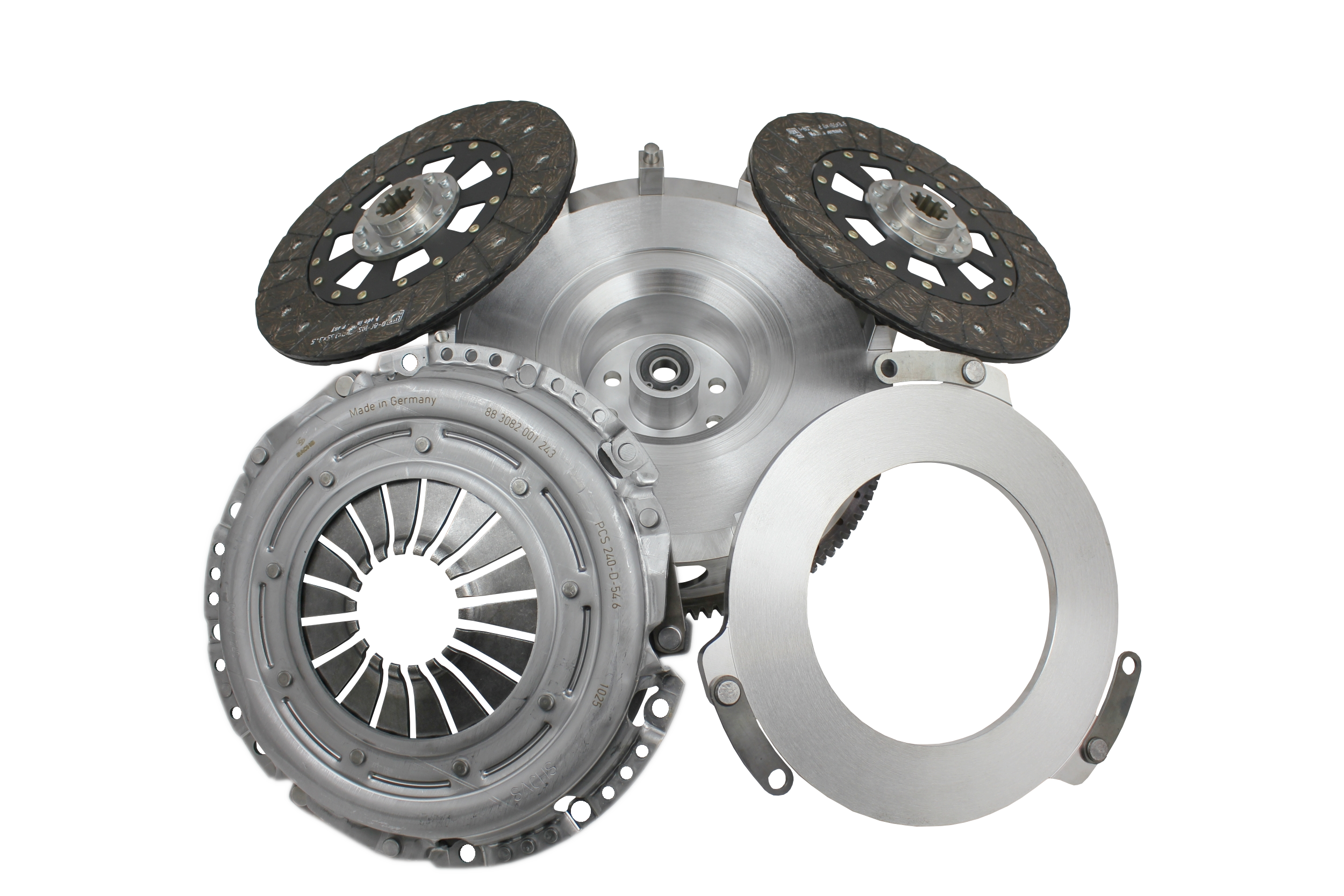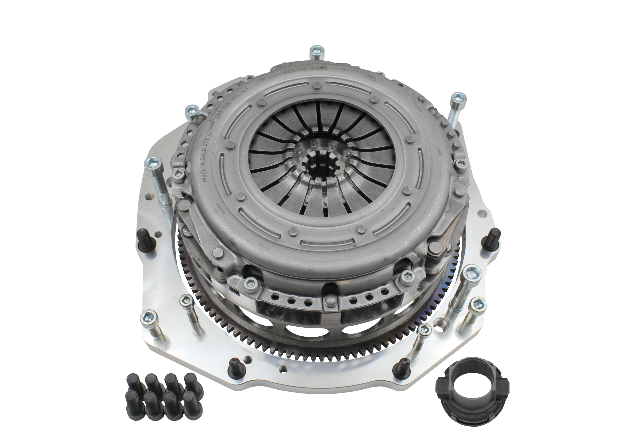 Sprzęgło 2 tarczowe TOYOTA JZ - BMW ZF M50/M52/M54 STAGE 3 Jednomasowe, stalowe koło zamachowe, toczone i frezowane CNC Masa koła ok. 8,2 kg. Masa całego sprzęgła bez tarcz ~15,2 kg. Tarcze 240 mm na stalowych podkładach obitych wzmocnioną okładziną firmy LUK (8090S) Nowy docisk Sachs Performance 883082001243 bez samoregulatorów Łożysko oporowe i śruby do koła zamachowego klasy 12.9 w zestawie Wszystkie sprzęgła wyważane są w systemie end to end, czyli całościowo na wyważarkach CNC Schenck - do 8500 rpm, protokół w zestawie Przeznaczony do połączenia silników TOYOTA 1JZ, 2JZ ze skrzyniami biegów ZF/GETRAG M50, M52, M54 oraz E36 M3 - moduł tarczy sprzęgła 23x29-10N Aluminiowy adapter łączący silnik ze skrzynią o grubości 19 mm wraz ze wszystkimi niezbędnymi śrubami. Adapter wymaga zastosowania rozrusznika DENSO serii 228000 bez aluminiowej osłony kółka napędu wieńca rozrusznika Maksymalna wydajność zestawu to około 1000 -1200 Nm. W drifcie do max. 1000 Nm w zależności od trakcji i sposobu użytkowania. Jeżeli strzelasz dużo ze sprzęgła zalecamy wersję na spiekach. Wymagane przejście procedury docierania - 1000 km lub 5000 zmian biegów