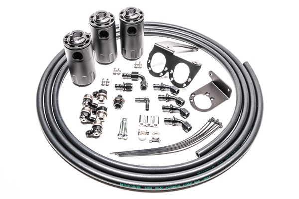 OVERVIEW Radium Engineering offers two different catch can kits for the R35:*The 20-0565 PCV line kit mounts near the brake master cylinder in the back of the engine bay and interfaces with the hose that goes from the PCV valve on the engine to the intake manifold (vacuum). NOTE: The PCV kit is NOT directly compatible with 08-11 GT-Rs which did not have an OEM strut bar.*The 20-0555 crankcase vent kit mounts on the front of the engine and interfaces with the breather lines coming off of the heads and going to the turbo intake piping. This kit contains two catch cans.These two kits can be purchased separately or together. When deciding which kit (or kits) to purchase, it is important to remember that both kits working together offer the most protection from oil ingestion into the engine. The PCV side kit is effective at keeping oil out of the intake manifold when the PCV valve is open, such as during light cruising, idle, etc. When in boost, the PCV valve closes and all the engine blow-by comes out of the head breathers. This is a good reason to have catch cans on the crankcase breathers. 20-0566-FL TRIPLE CATCH CAN KIT, NISSAN R35 GT-RFor the ultimate in engine protection, Radium recommends 20-0566-FL Triple Catch Can Kit, Nissan R35 GT-R. Kit feature the following: -Anodized oil catch can(s) with integrated condenser and dipstick(s)-Anodized aluminum R35 GT-R specific mounting brackets-Anodized aluminum -AN adapter fittings and hose ends-Stainless steel mounting hardware-Radium Engineering PCV hose Instruction PDF