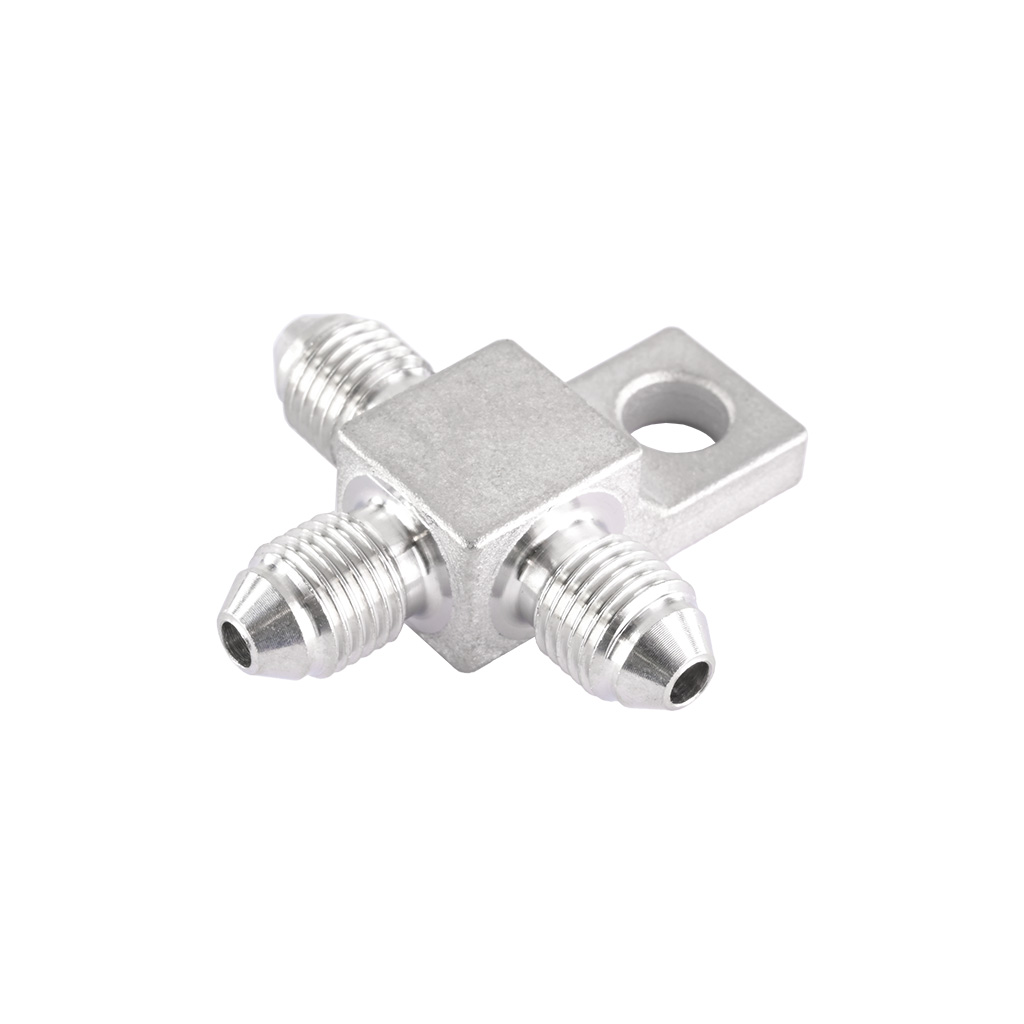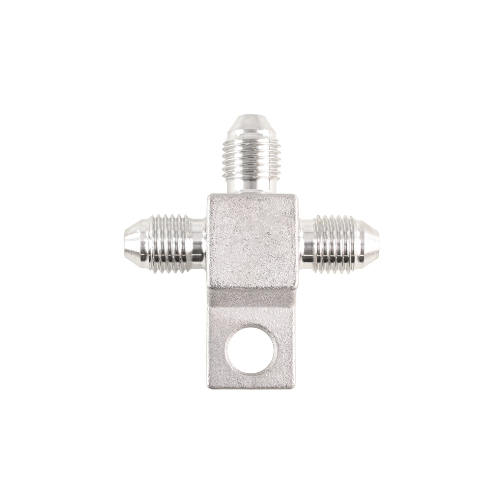 Trójnik do układu hamulcowego AN3 3/8-24 UNF SS304 Trójnik przewodu hamulcowego AN3 to wytrzymały element przeznaczony do budowy i modyfikacji układów hamulcowych w samochodach sportowych, torowych oraz projektach.Wykonany z wysokiej jakości stali nierdzewnej, stanowi znacznie trwalszą alternatywę dla standardowych trójników miedzianych, szczególnie w aplikacjach narażonych na wysokie ciśnienie i temperaturę. Złącze posiada trzy identyczne wyjścia AN3 (3/8-24 UNF) z uszczelnieniem stożkowym 37°, zapewniając pewne połączenie przewodów hamulcowych. Dodatkowy otwór montażowy o średnicy 7mm umożliwia mocowanie trójnika do podwozia lub uchwytów. Dzięki swojej konstrukcji trójnik znajduje zastosowanie nie tylko w układach hamulcowych, ale również w układach paliwowych, olejowych, chłodzenia oraz wspomagania. Cechy produktu:-Standard AN-3 (D-03)-Gwinty męskie 3/8-24 UNF-Uszczelnienie stożkowe -Wykonany ze stali nierdzewnej-Otwór montażowy zapewniający łatwy i stabilny montaż-Wyższa wytrzymałość niż trójniki miedziane Specyfikacja techniczna:-Standard: AN-3 / D-03-Gwint: 3 × 3/8-24 UNF (męski)-Kąt uszczelnienia: 37° (AN flare)-Materiał: SS304-Średnica otworu montażowego: 7 mm
